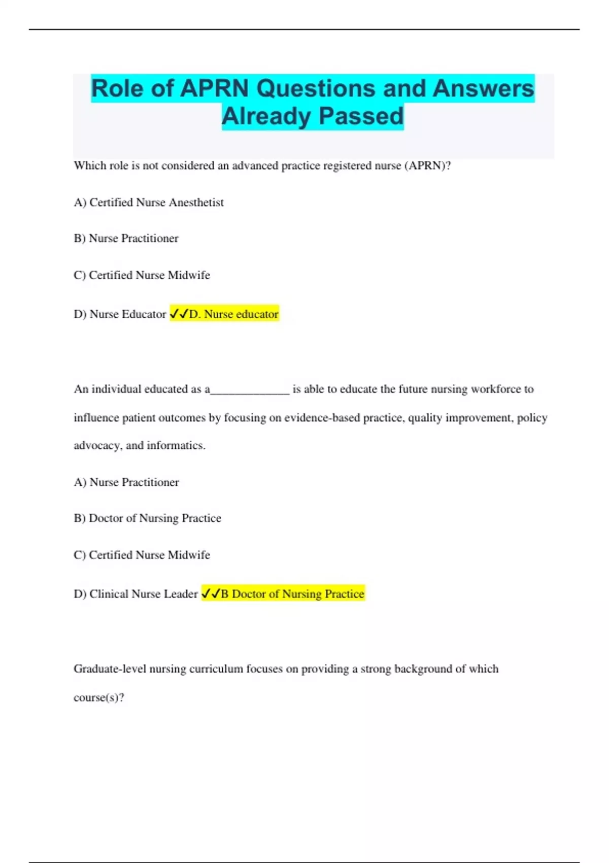 Role of APRN Questions and Answers Already Passed