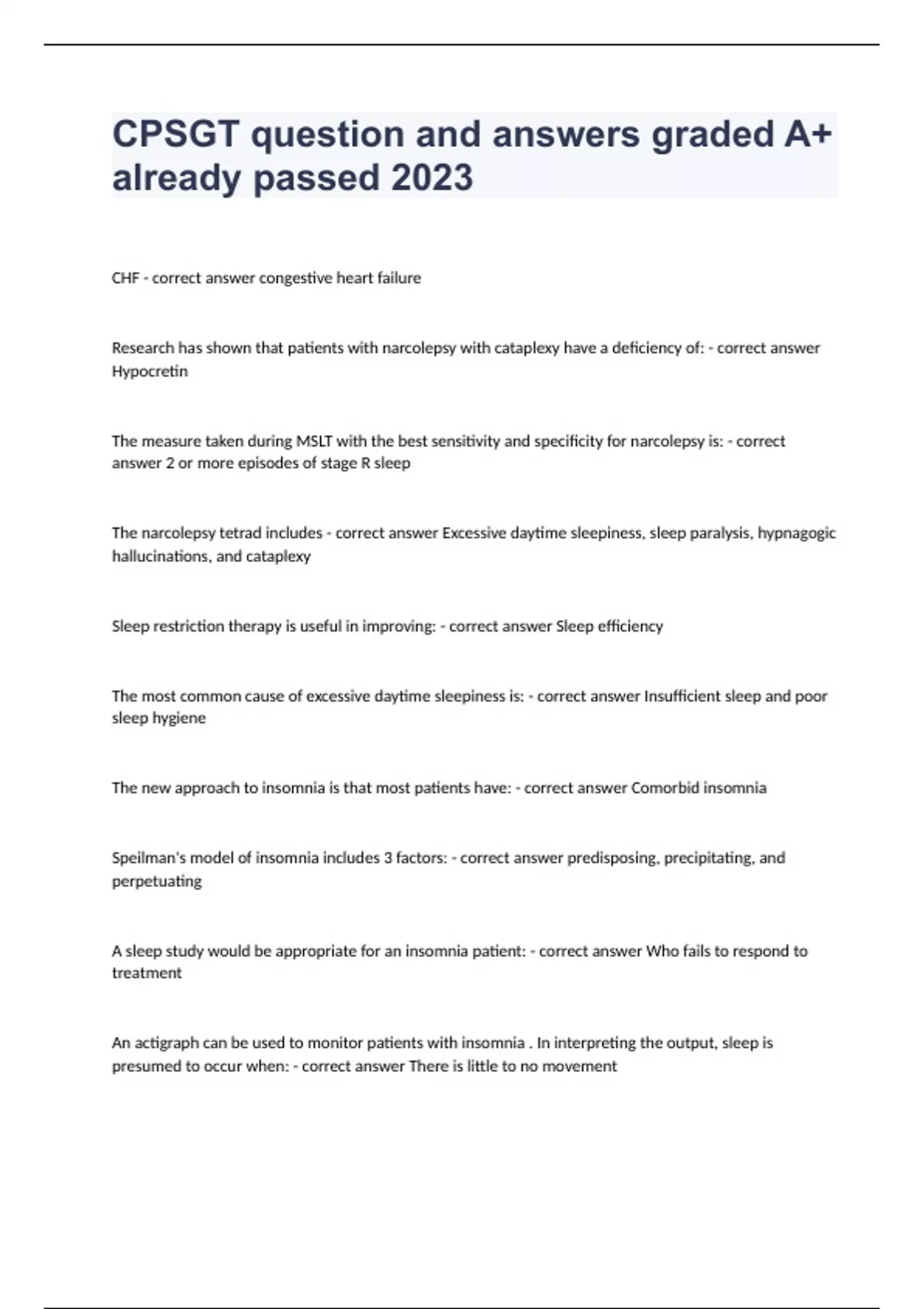 1 Exam (elaborations) RPSGT- exam 2 question with complete solution graded A+ 2023 2 Exam (elaborations) Kettering Review(2023 updated)question and answers rated A+ 3 Exam (elaborations) Chapter 1 ) Overview of Sleep Medicine Physiology and Technology and (Chapter 2 ) Classification of Sleep Disorders (Part 1) 2023 updated 4 Exam (elaborations)