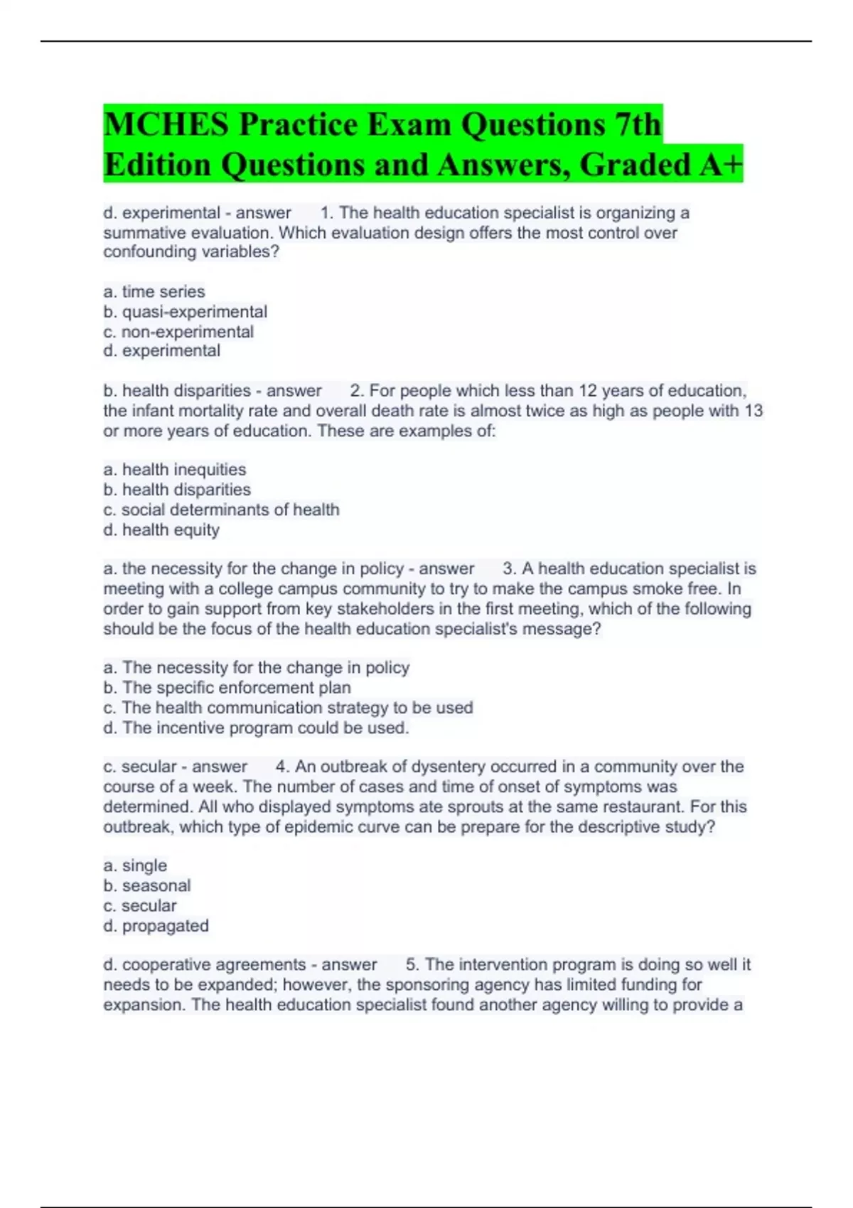 Exam (elaborations) hsc3032 exam 3 Questions and Answers 100% correct Exam (elaborations) The health education specialist Questions and Answers 2023 Exam (elaborations) HLTH 310 Chapter 6 Questions and Answers 2023 Exam (elaborations) health 210 chapter 6 Questions and Answers 2023 Exam (elaborations) HSC3032 Chapter 6 Questions and Answer