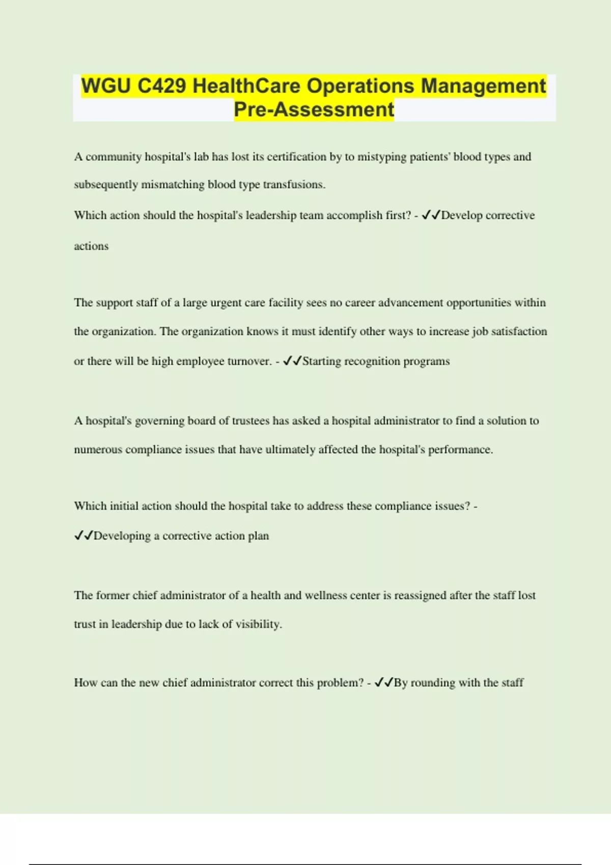 WGU C429 HealthCare Operations Management – Pre-Assessment | Questions with 100% Correct Answers | Verified | Latest Update