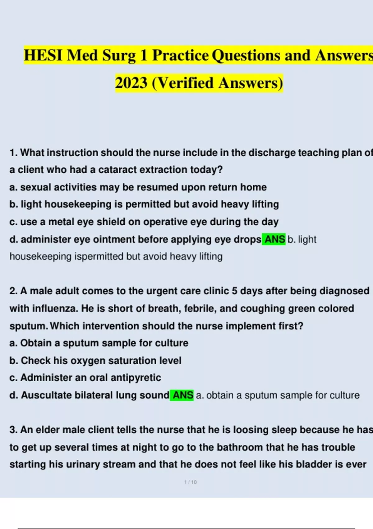 HESI Med Surg 1 Practice Questions and Answers 2023 (Verified Answers)