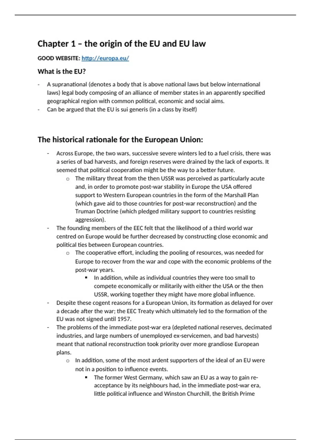 This set of documents covers all of the EU Law module in English universities - this includes detailed notes on EU institutions, sources of EU law, implementation of EU law into national legal systems, member state liability, the impact of Brexit and both the free movement of persons and goods throughout the EU.
