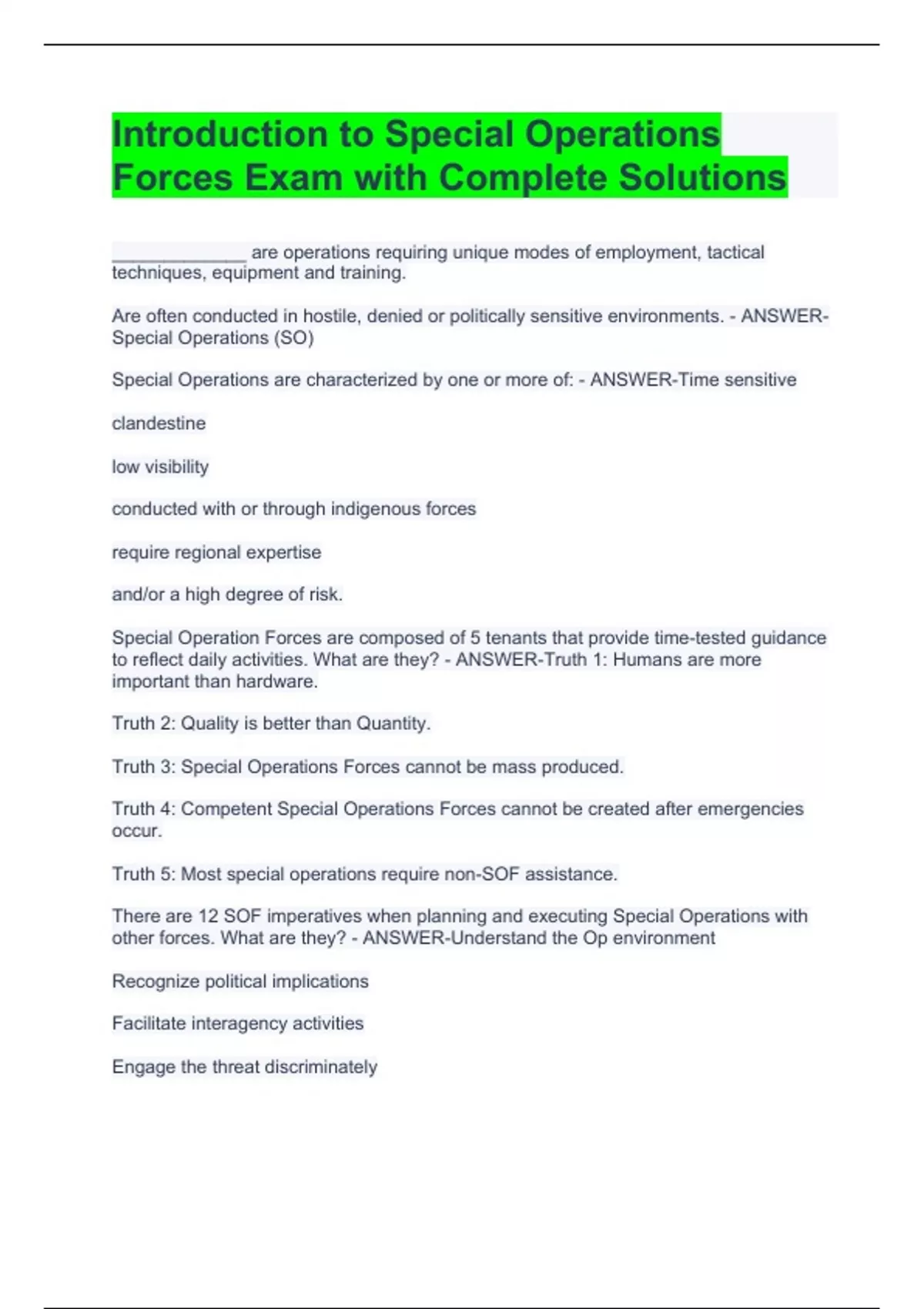 Introduction to Special Operations Forces Exam with Complete Solutions Army Special Forces Exam Answered Special operations Questions and Answers 2023 Armed Forces Overview Questions -Solved