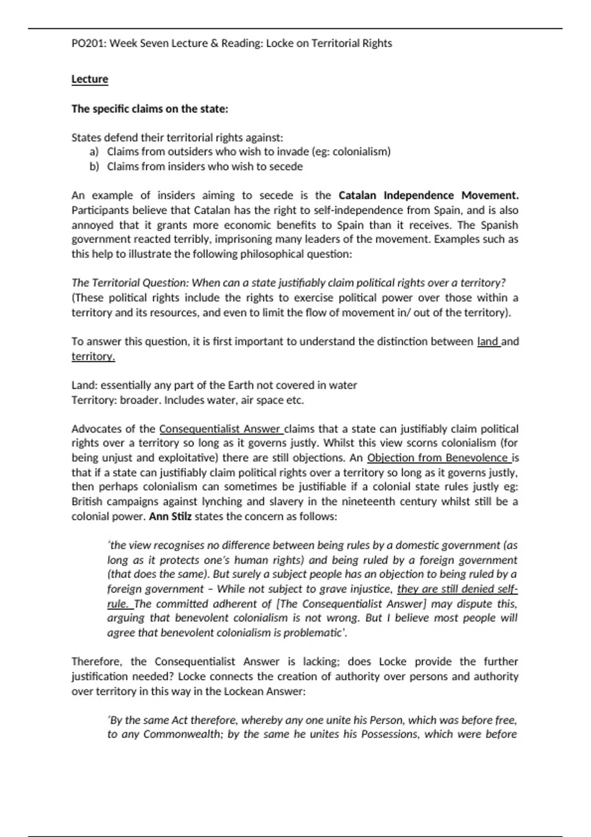 This bundle includes notes on both Locke's Treatises of Government, and his work on territorial rights. This covers three weeks-worth of Warwick PAIS' Political Theory from Hobbes (PO201) Second-Year Compulsory Module.