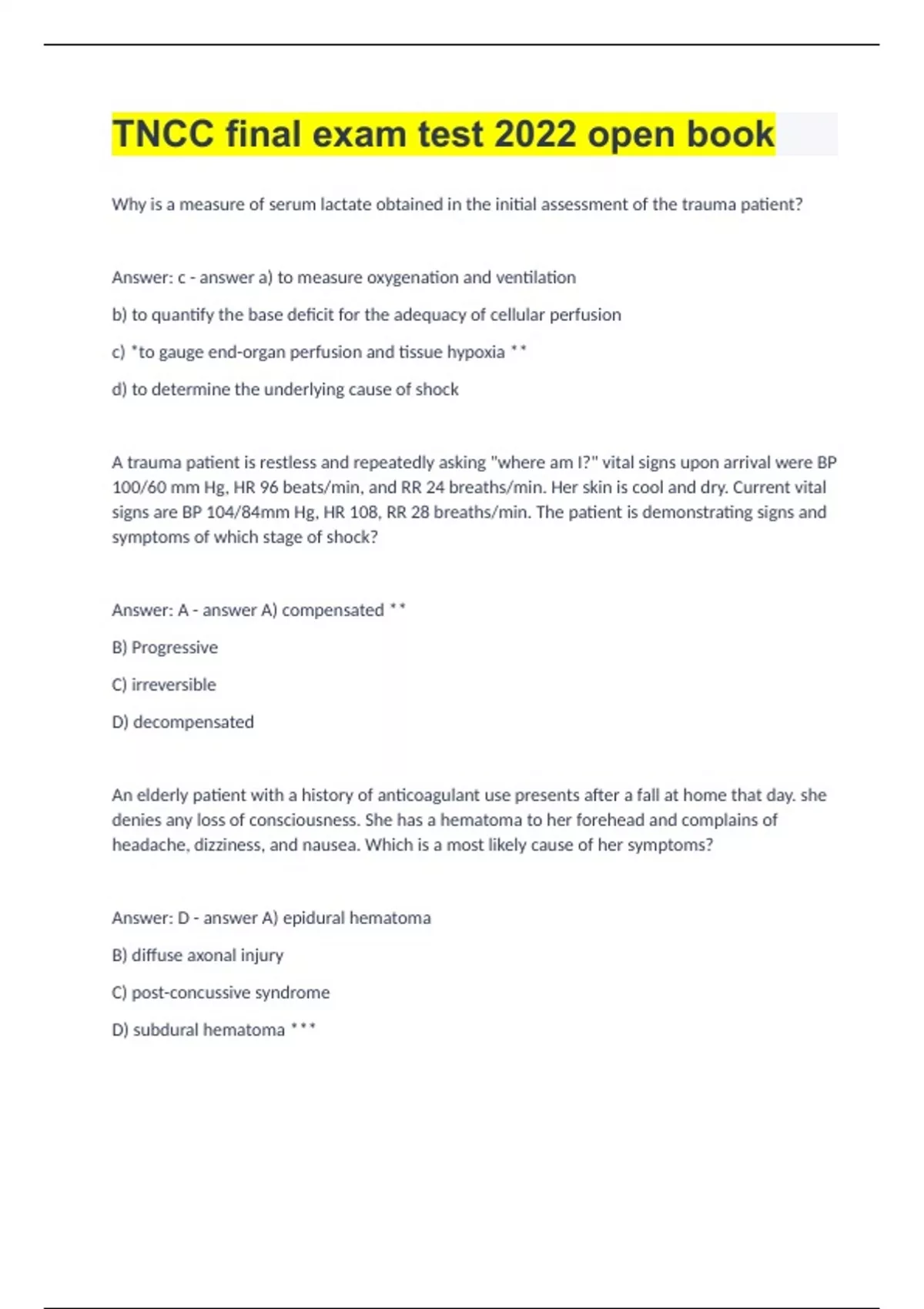 TNCC EXAM QUESTIONS AND ANSWERS
