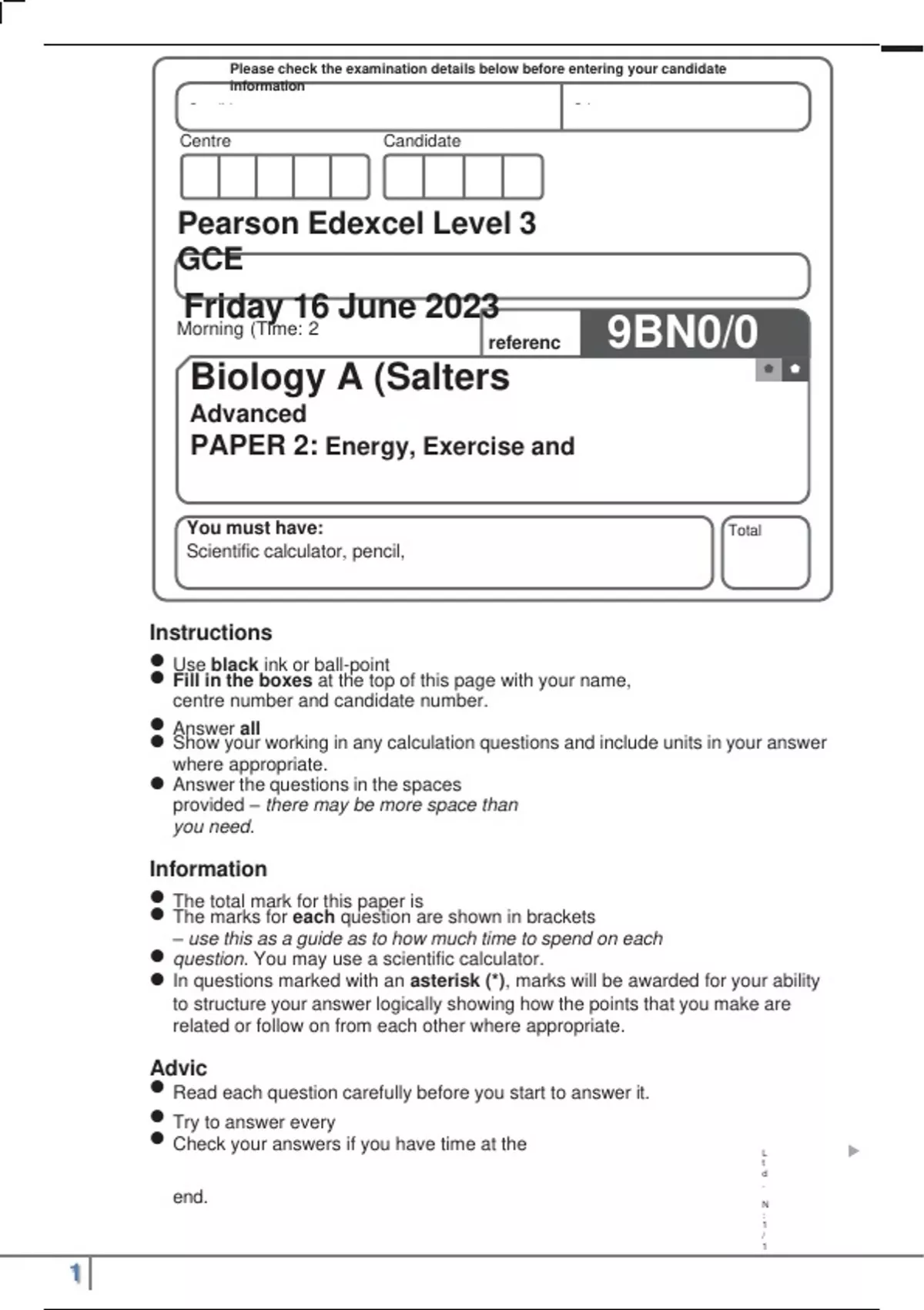 Pearson Edexcel Biology A Advanced PAPER 2 Energy, Exercise and Coordination June 2023