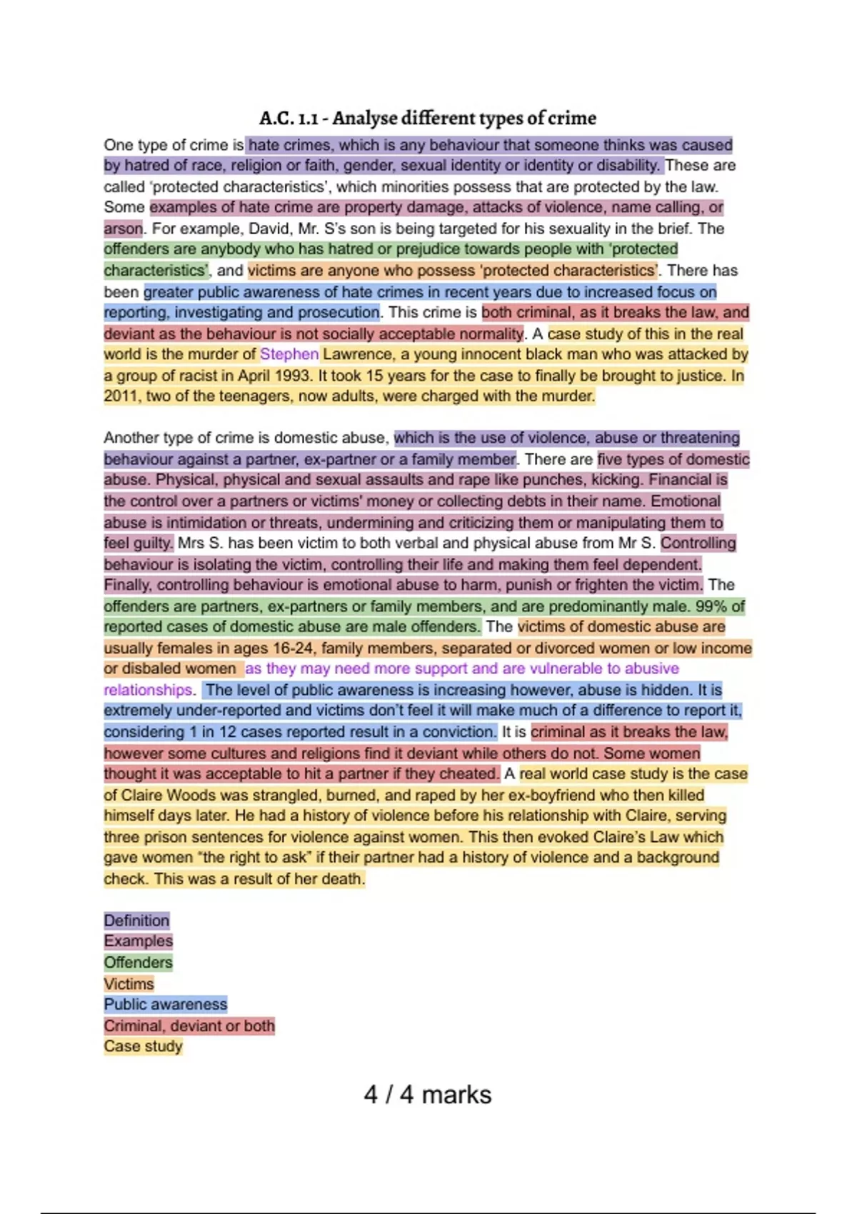 These are the collections of write ups I made for Unit 1: Changing Awareness of Crime to achieve an 100 UMS score and achieve an A*. NO A.C.3.3! Includes all of LO1, summary sheets and write ups for LO2, and 3.1 and 3.1 with a help sheet to guide you. WARNING: you may be disqualified from the exam for plagiarism if you hand my work in as your own.