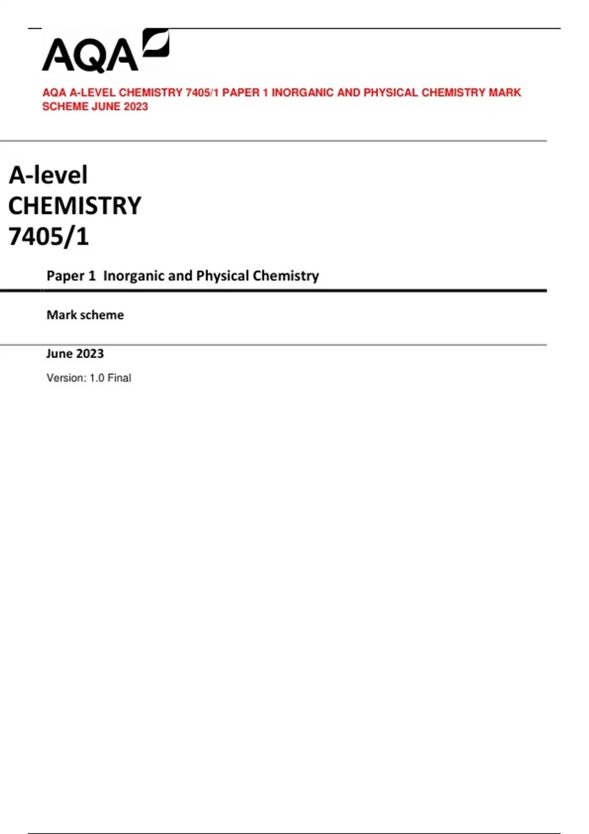 AQA A-level CHEMISTRY 7405/1 Paper 1 Inorganic and Physical Chemistry Mark scheme June 2023 Version: 1.0 Final