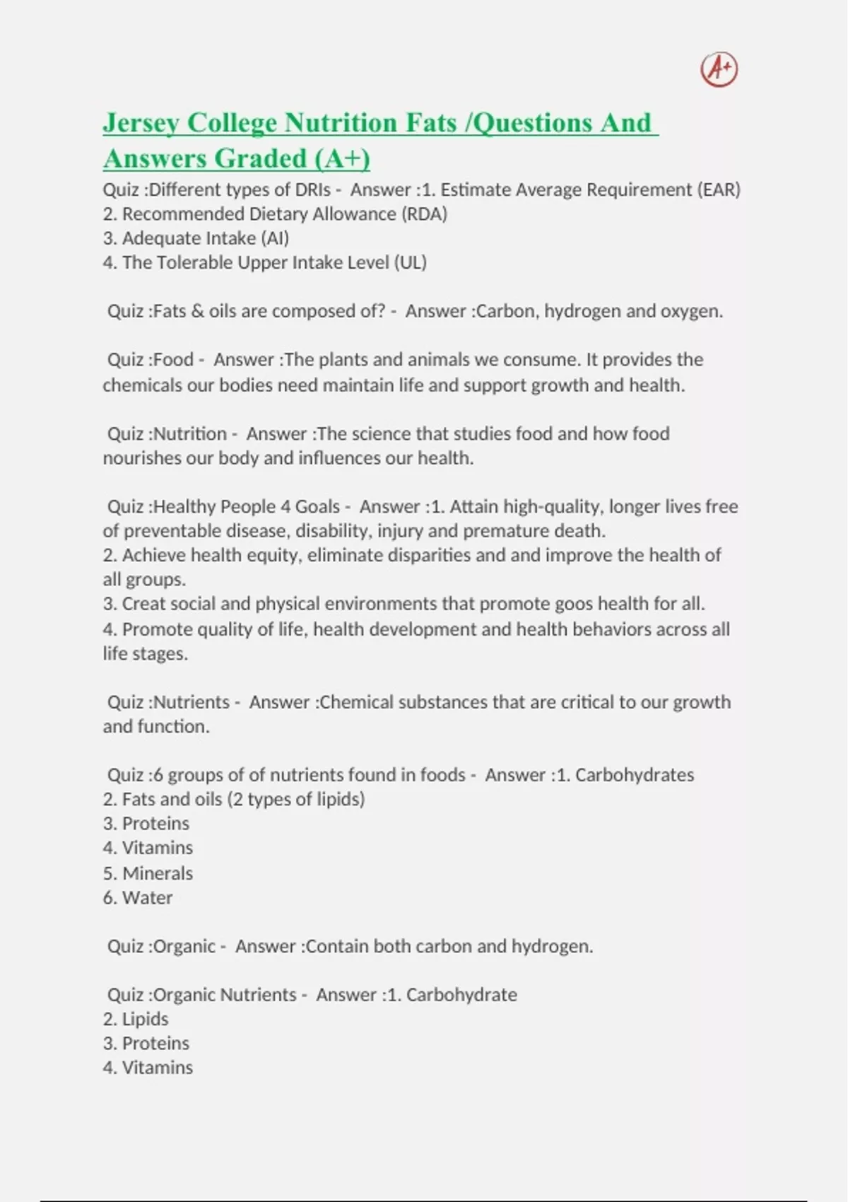 Jersey College Nutrition Midterm Review /Questions And Answers
