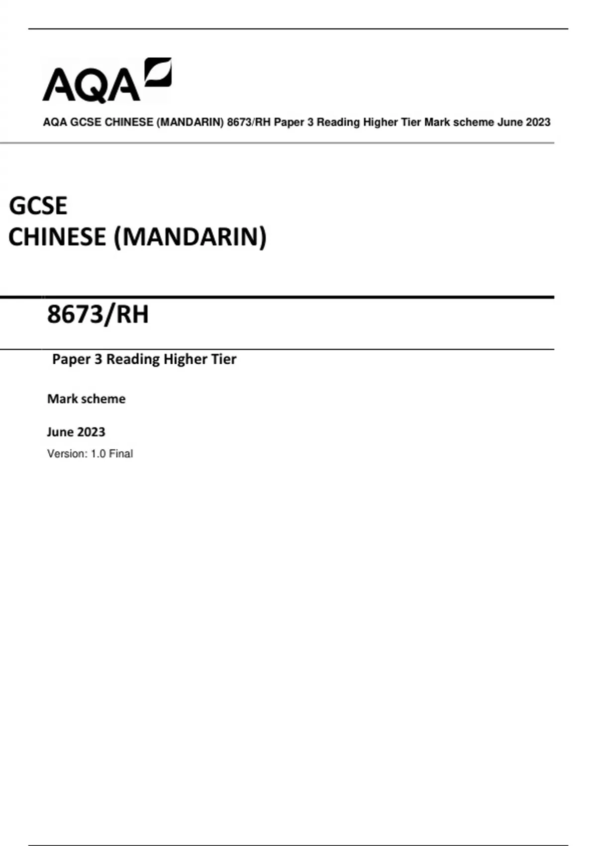 AQA GCSE CHINESE (MANDARIN) 8673/RH Paper 3 Reading Higher Tier Mark scheme June 2023