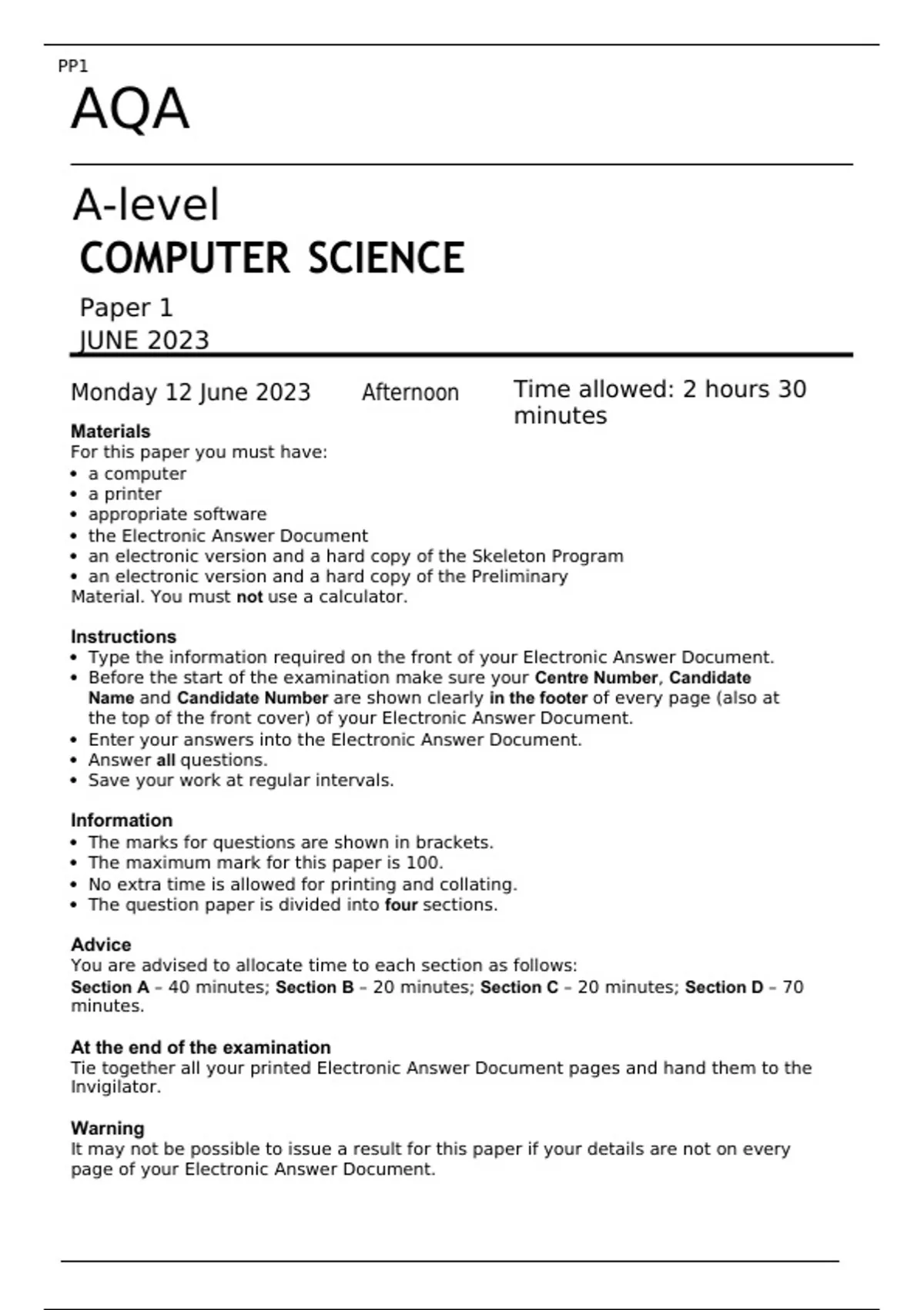AQA A-level COMPUTER SCIENCE Paper 1 JUNE 2023 FINAL QUESTION PAPER