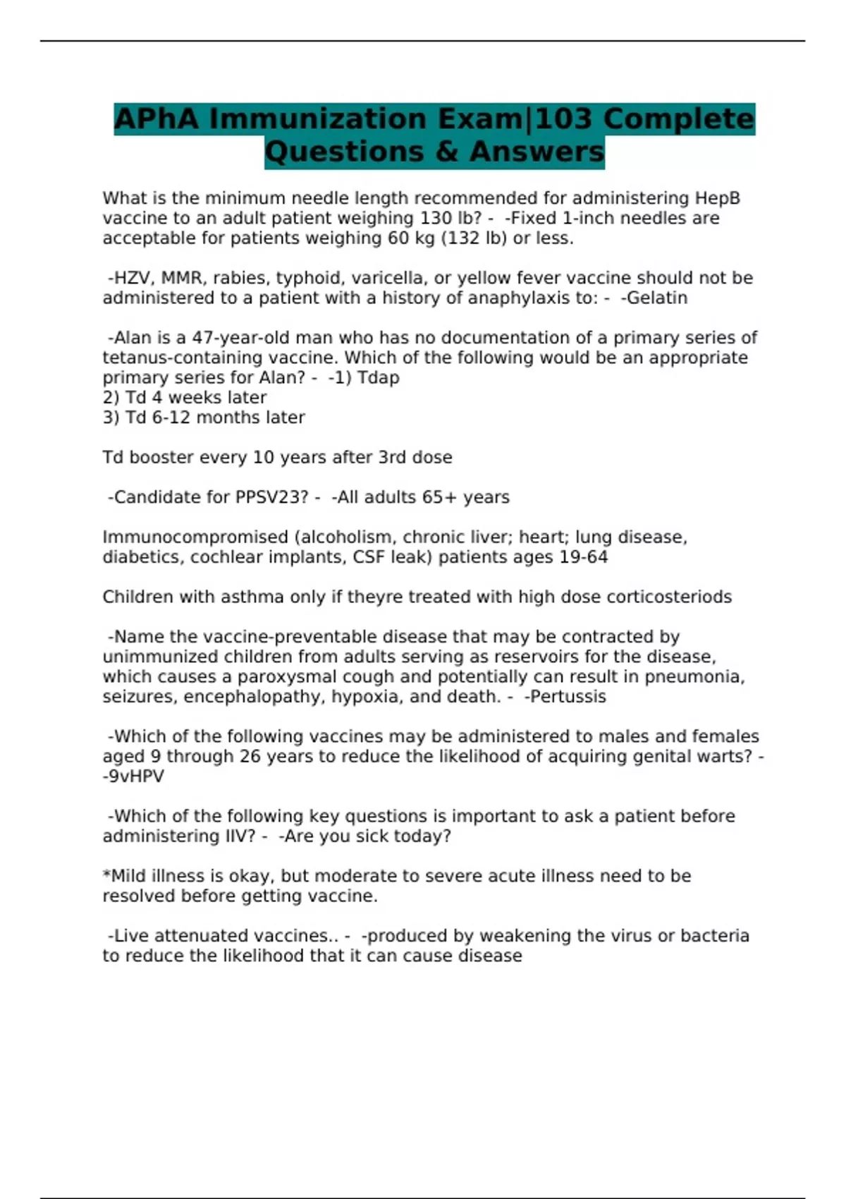 APha Immunization Final Exam Questions and Answers A+ Rated