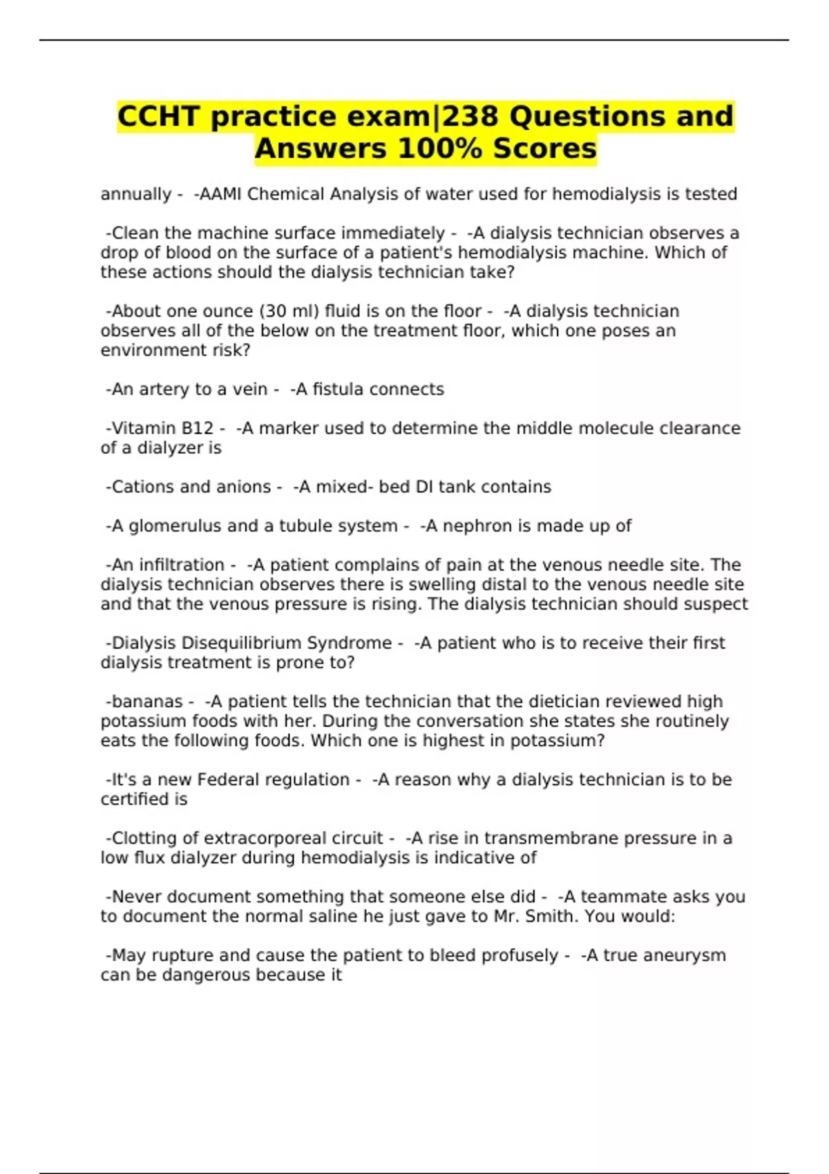 CCHT PRACTICE EXAM DAVITA – QUESTIONS AND ANSWERS -100% SCORES