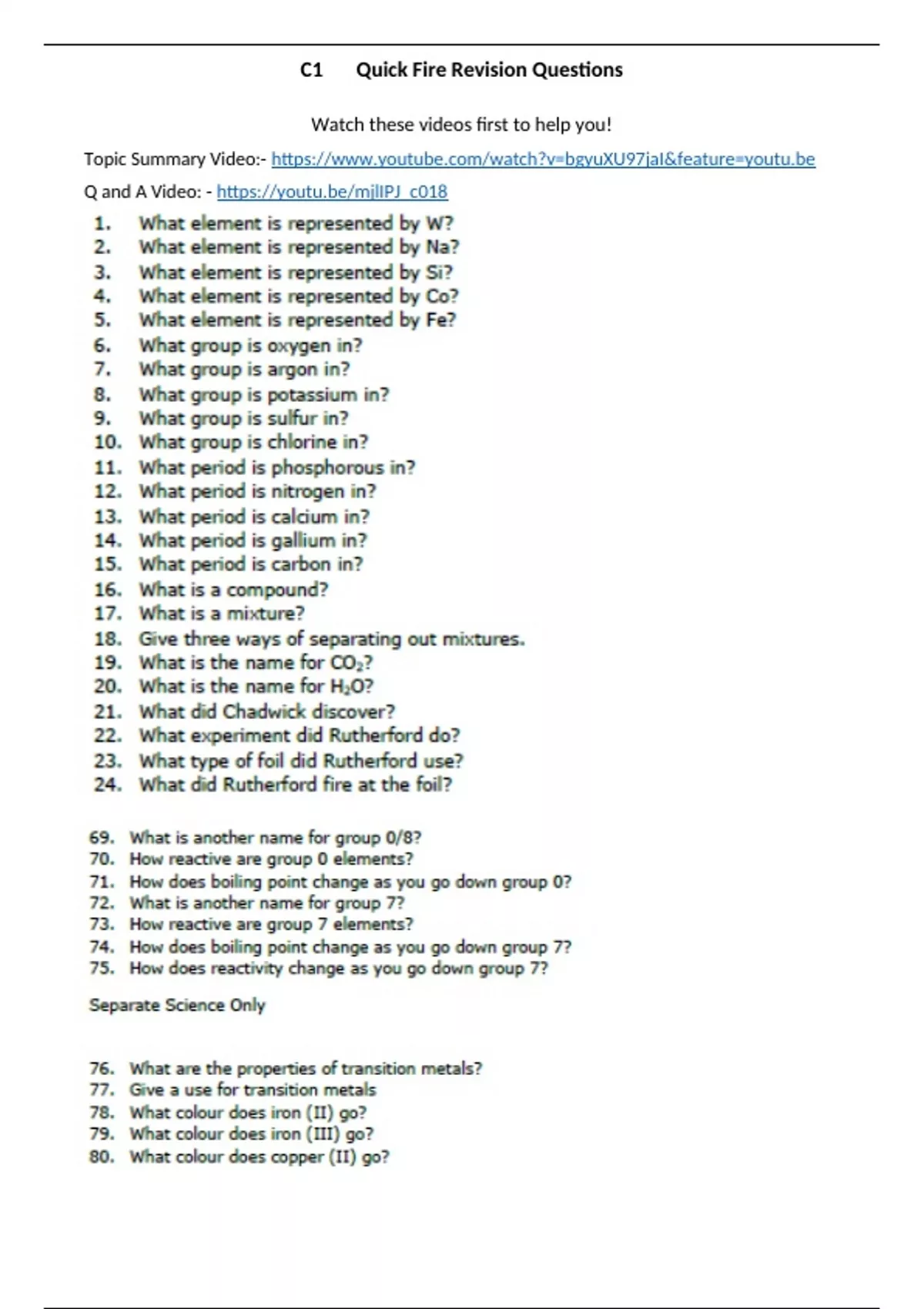 GSCE Chemistry C1 quick fire questions and revision sheets