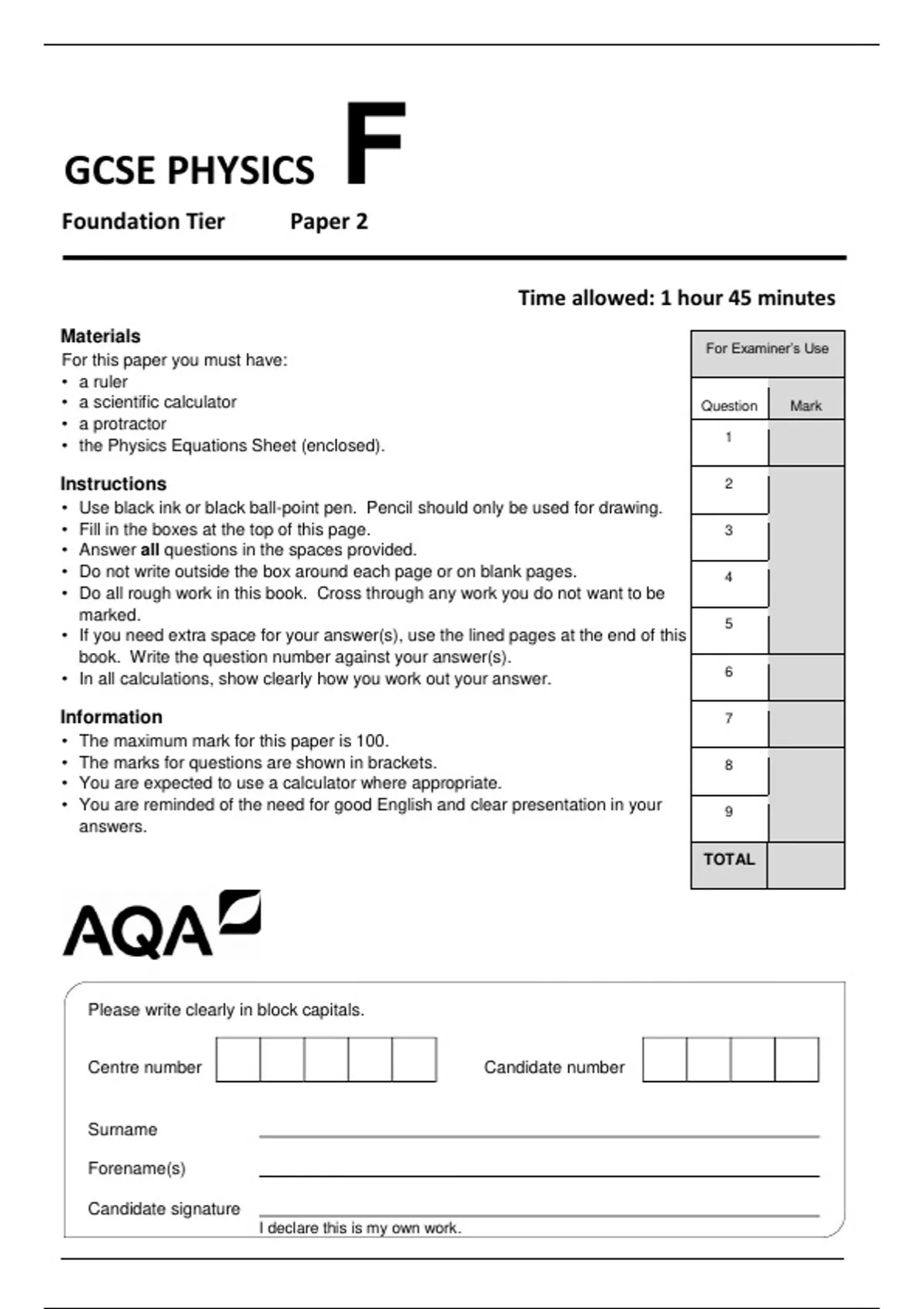 AQA GCSE PHYSICS 8463 2F Paper 2 Foundation Tier Question Paper & Mark scheme June 2022.