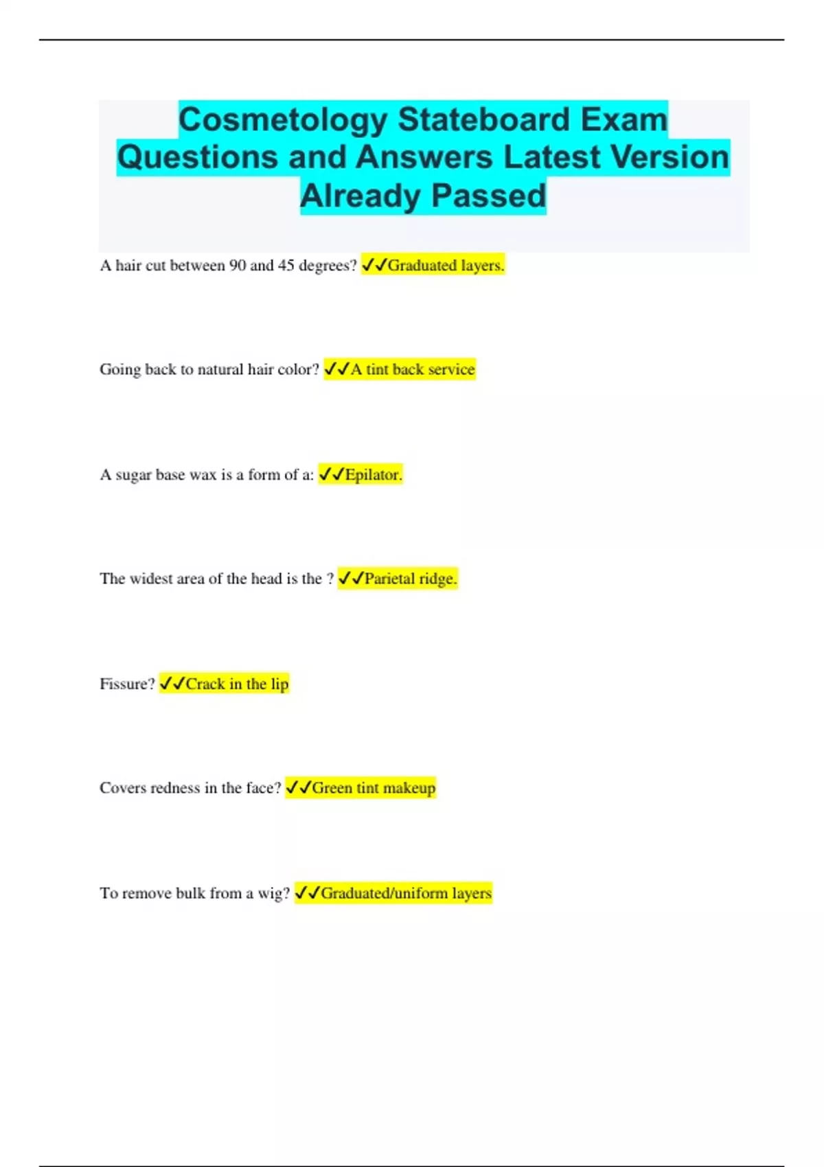 Cosmetology Stateboard Exam Questions and Answers Latest Version Already Passed