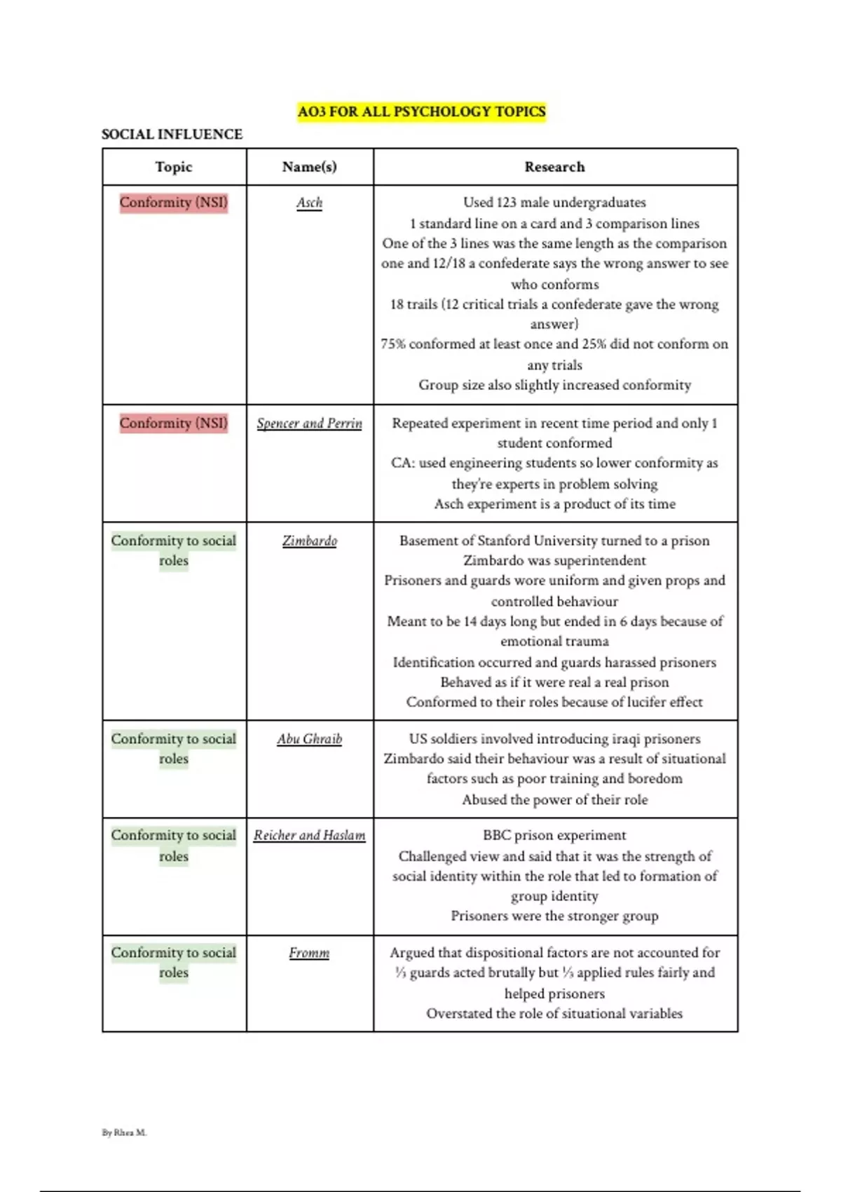 This table helped me attain A* in every psychology exam. This document provides A* standard research (AO3) in Paper 1 psychology topics including: social influence, memory, attachment and psychopathology. It is clear and coherent, offering a clear and easy format to understand researcher evaluations.