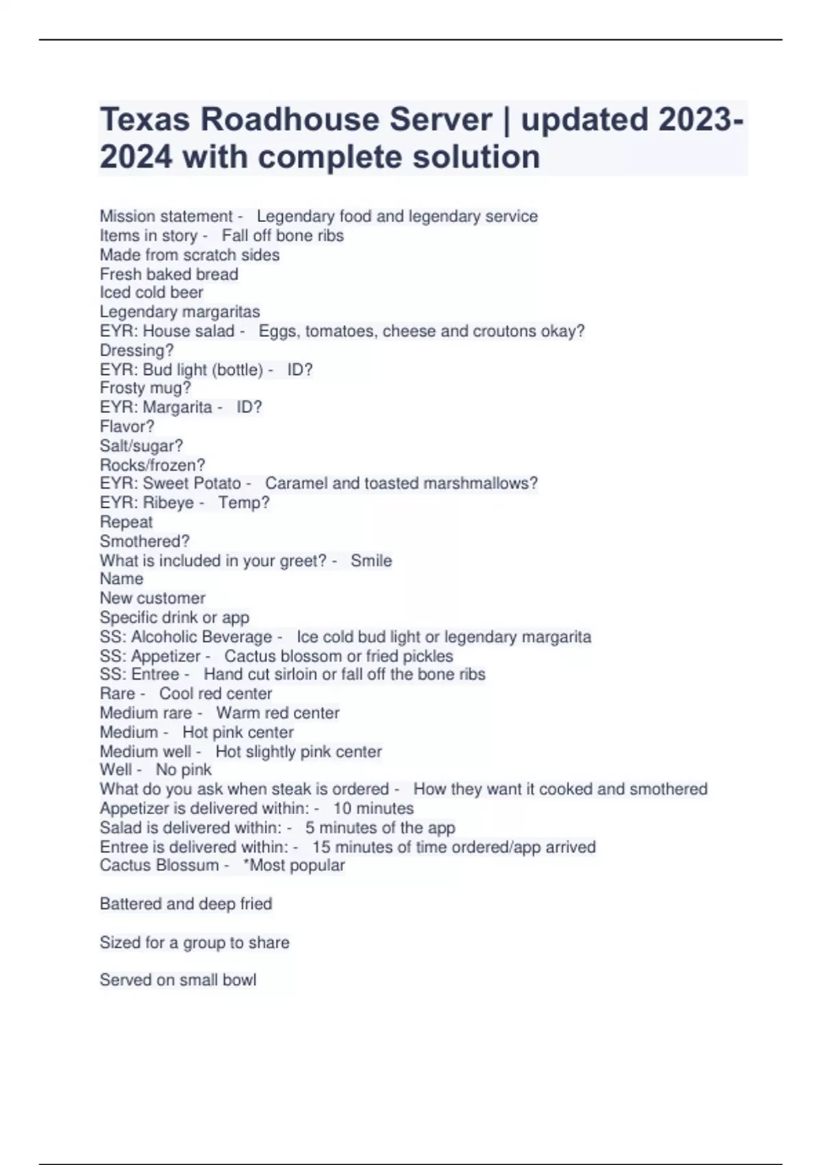 Exam (elaborations) Texas Roadhouse Menu test | Questions and answers | RATED A 2 Exam (elaborations) Texas Roadhouse Menu Test | With complete solution | Updated 3 Exam (elaborations) Texas Roadhouse Menu Test | With complete solution | RATED A 4 Exam (elaborations) Texas Roadhouse Menu Test Key | With complete solution | 100% verified correc
