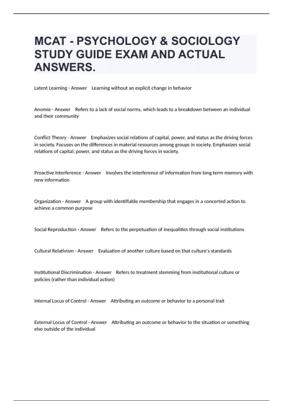 1 Exam (elaborations) MCAT Psychology and Sociology Terms Exam Questions Fully Answered. 2 Exam (elaborations) MCAT Psychology and Sociology Terms Exam Questions Fully Answered. 3 Exam (elaborations) MCAT Psych/Soc – Memory Training Exam And Guaranteed Pass Solutions. 4 Exam (elaborations) MCAT Psych/Soc Names Prep Exam With Solutions Rated A+.