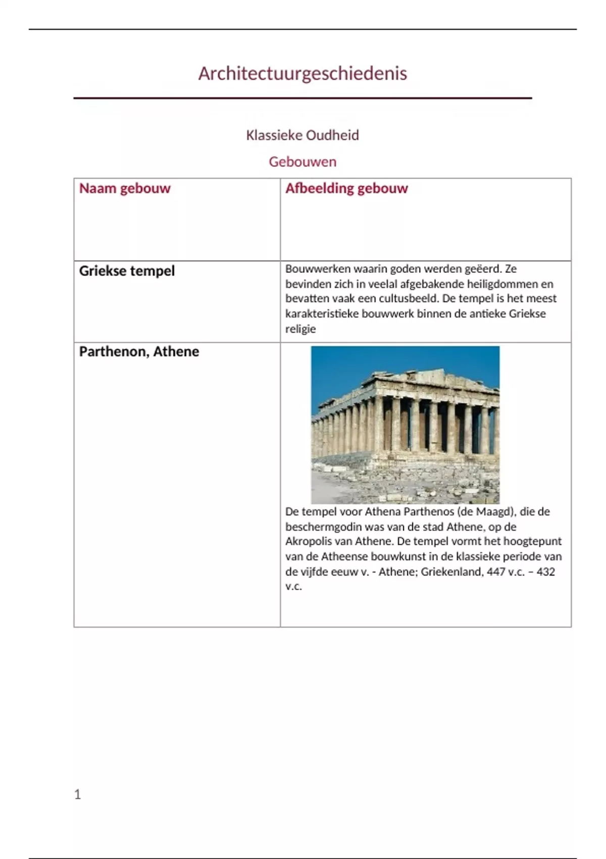 Dit is een overzicht van de te kennen gebouwen uit de PPTs/boek met term - afbeelding/en - extra uitleg. De periodes in de documenten zijn: Klassieke Oudheid, Middeleeuwen, Renaissance in Italië 15e e/16e eeuw, Renaissance buiten Italië, Barok in Rome/Brussel, Barok buiten Italië, Classicisme 18e eeuw, 19e eeuw, Art Nouveau en Modernisme.