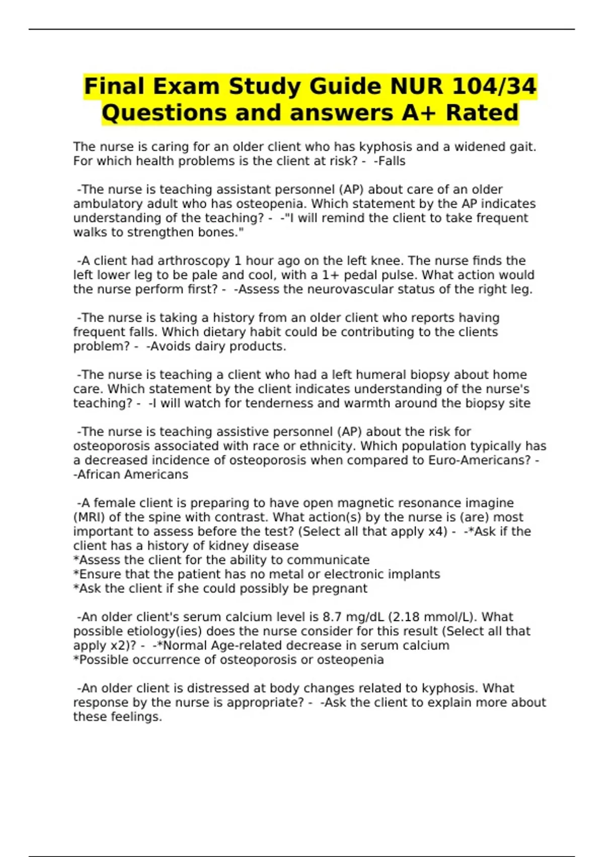 Final Exam Study Guide NUR 104/34 Questions and answers A+ Rated