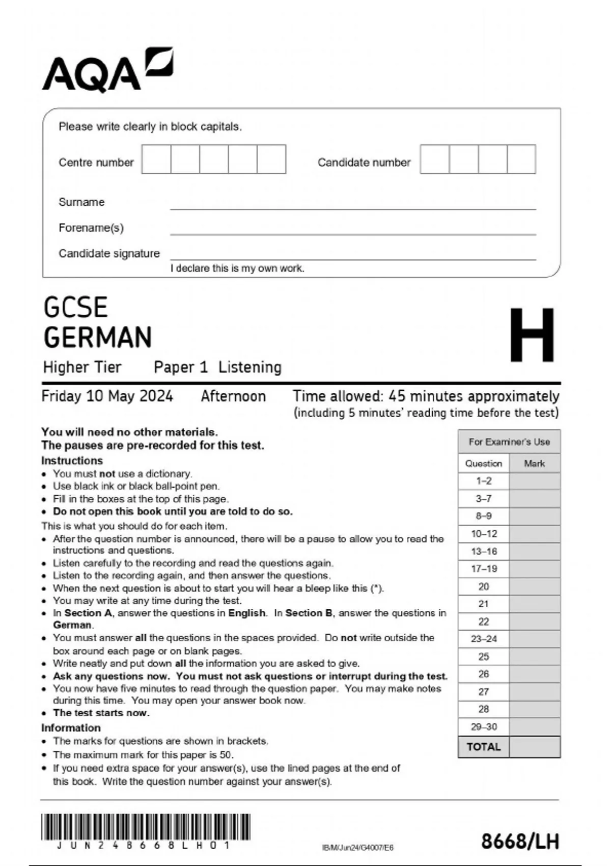 2024 AQA GCSE GERMAN HIGHER LISTENING PAPER 1 WITH TEST TRANSCRIPT
