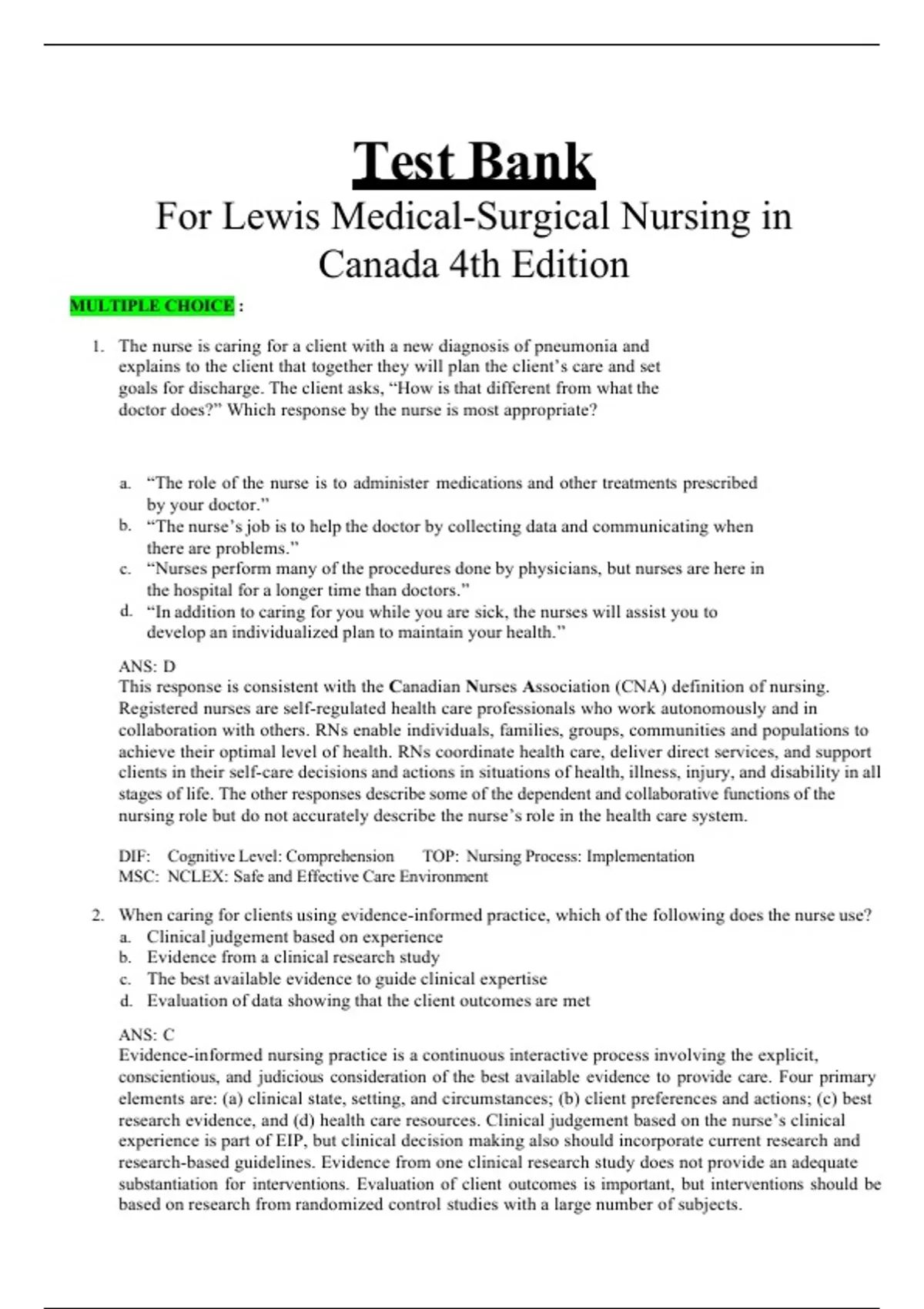 TEST BANK: Lewis s Medical Surgical Nursing in Canada 4th& 5th Edition 2024