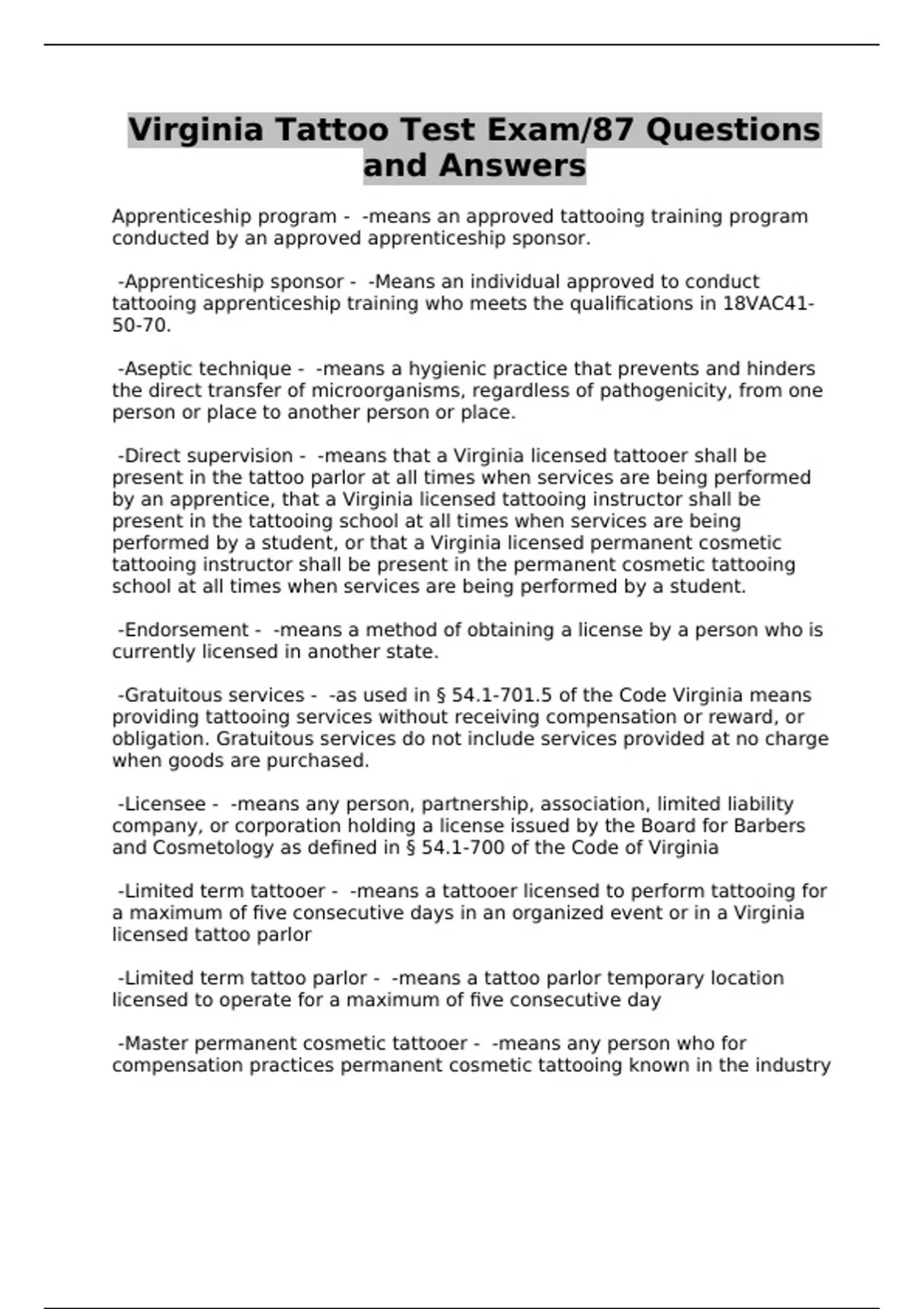 Virginia Tattoo Test Exam/87 Questions and Answers