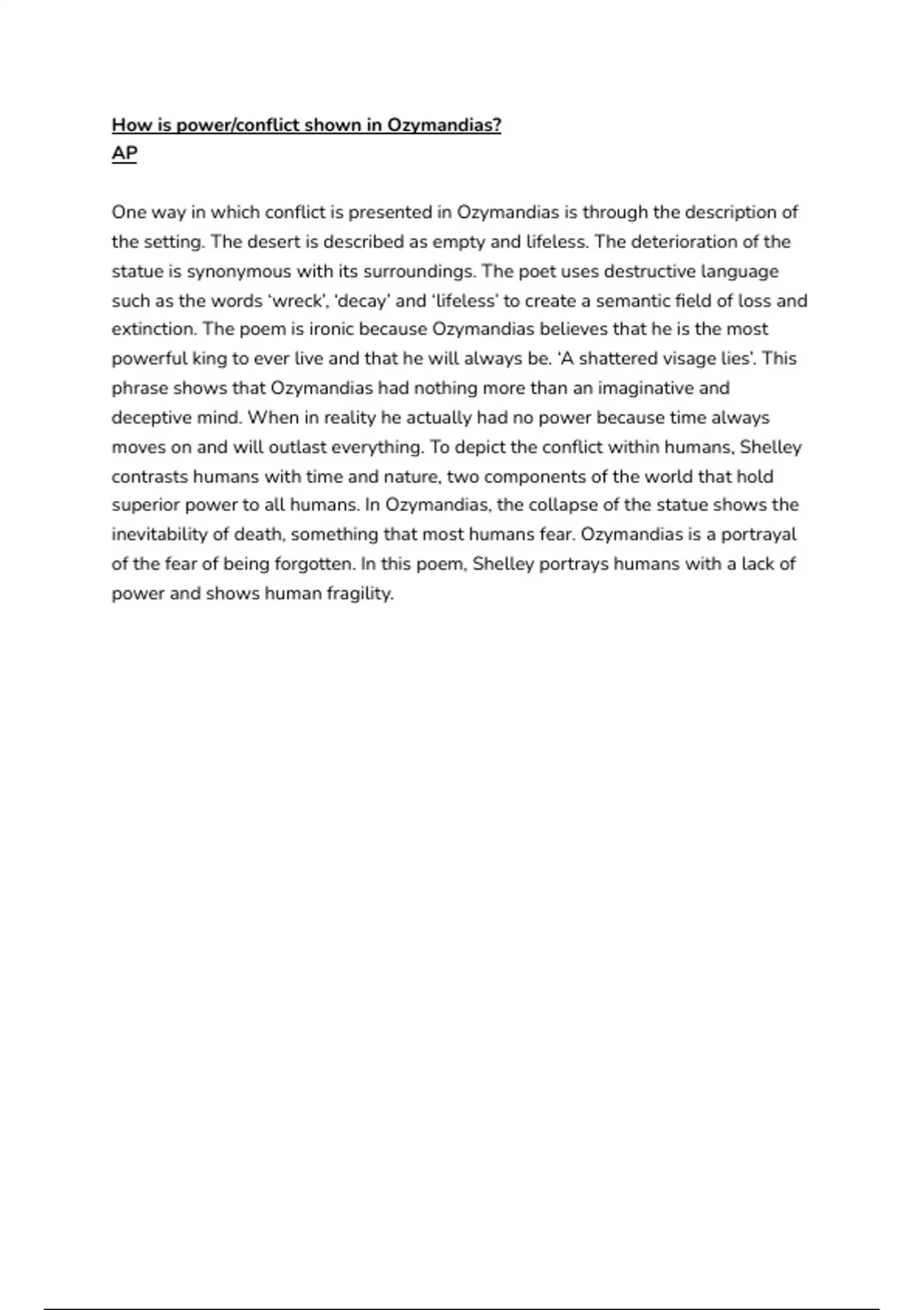 This package contains a mix of example answers and notes about the following power and conflict poems; Ozymandias London Remains Kamikaze Bayonet Charge Tissue Storm on the Island My Last Duchess All documents, whether example answers or notes include key quotes and contextual (and explain their significance with further analysis).
