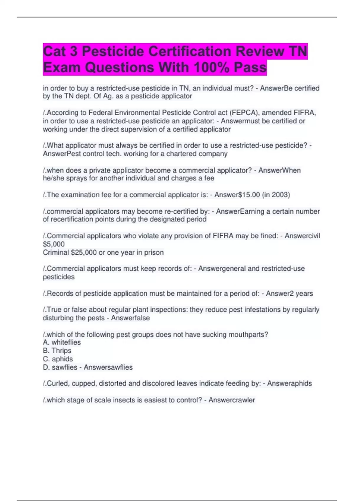 Exam (elaborations) Tennessee Cat 3 Certification Test 100% solved 2 Exam (elaborations) Cat 3 Pesticide Practice Exam Questions With Detailed Answers(Graded A+) 3 Exam (elaborations) Cat 3 Pesticide Certification Review TN Exam Questions With 100% Pass