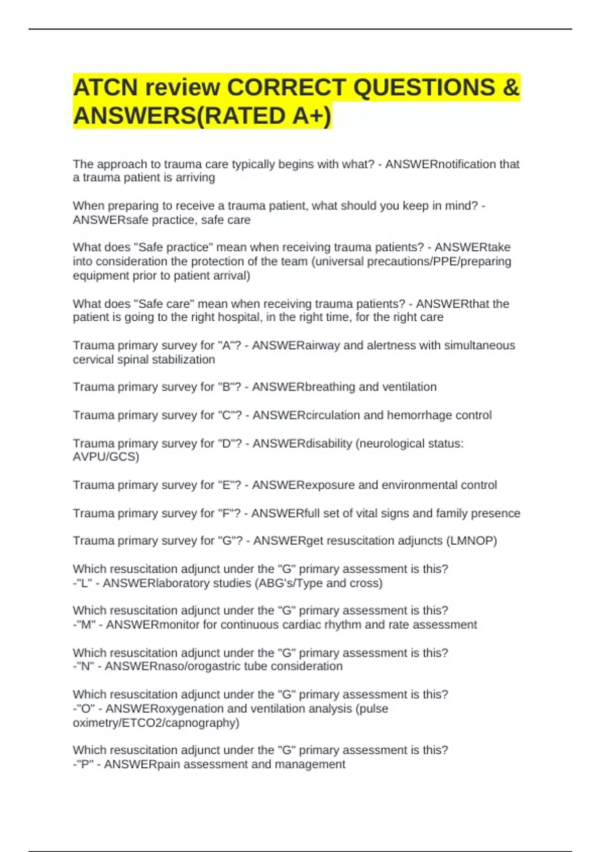 ATCN EXAM PACKAGE DEAL||QUESTIONS AND ANSWERS 100% CORRECT!!ATCN EXAM PACKAGE DEAL||QUESTIONS AND ANSWERS 100% CORRECT!!ATCN EXAM PACKAGE DEAL||QUESTIONS AND ANSWERS 100% CORRECT!!ATCN EXAM PACKAGE DEAL||QUESTIONS AND ANSWERS 100% CORRECT!!ATCN EXAM PACKAGE DEAL||QUESTIONS AND ANSWERS 100% CORRECT!!ATCN EXAM PACKAGE DEAL||QUESTIONS AND