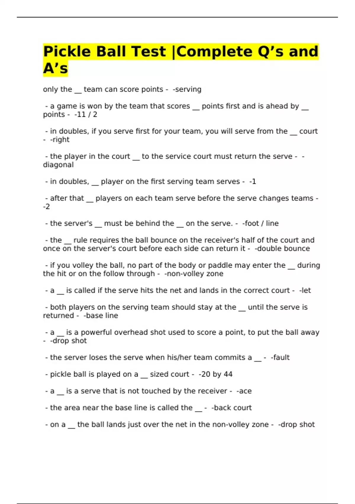 Pickle Ball Test Review Exam Questions with Solutions