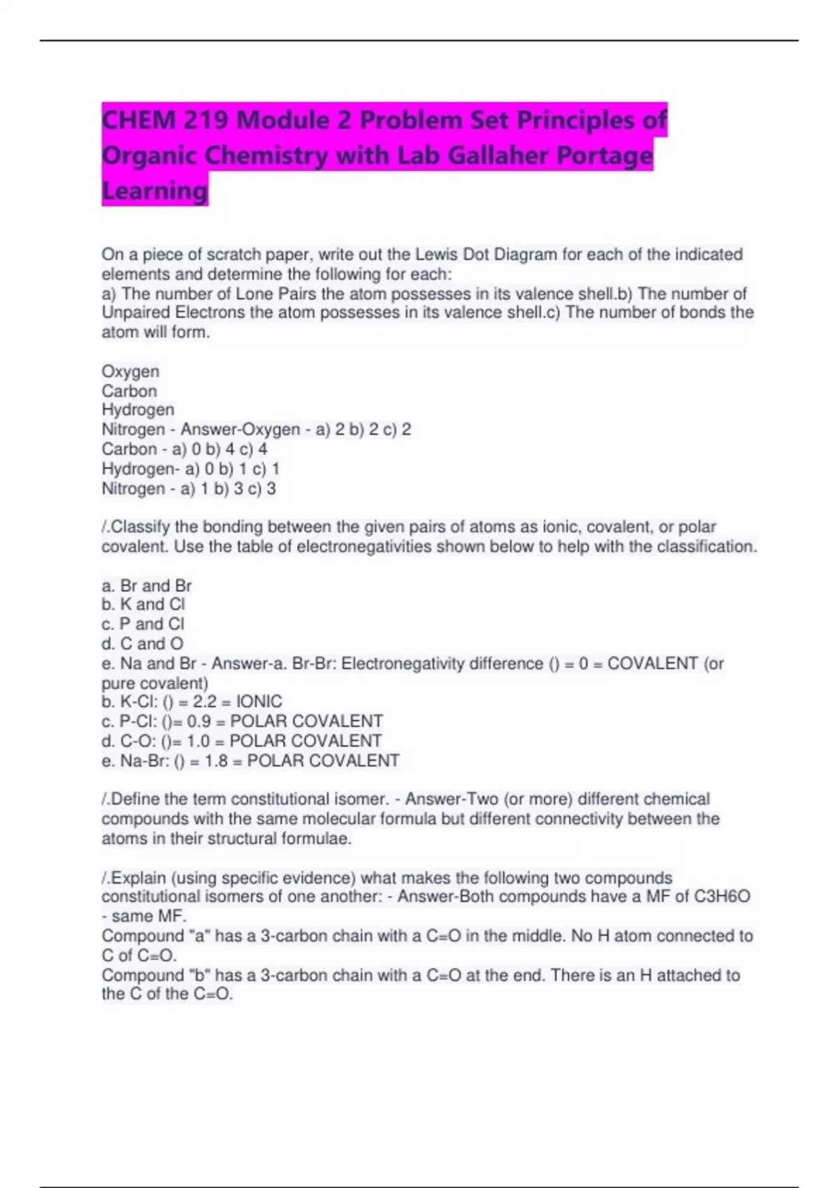 Exam (elaborations) CHEM 219 Exam # 3 Questions With Verified Answers 2 Exam (elaborations) CHEM 219 Module 2 Problem Set Principles of Organic Chemistry with Organic Chemistry with Lab Gallaher Portage Learning 3 Exam (elaborations) chem 219 module 6 Exam Questions And Answers 4 Exam (elaborations) Chem 219: Module 2 Exam Questions With Comple