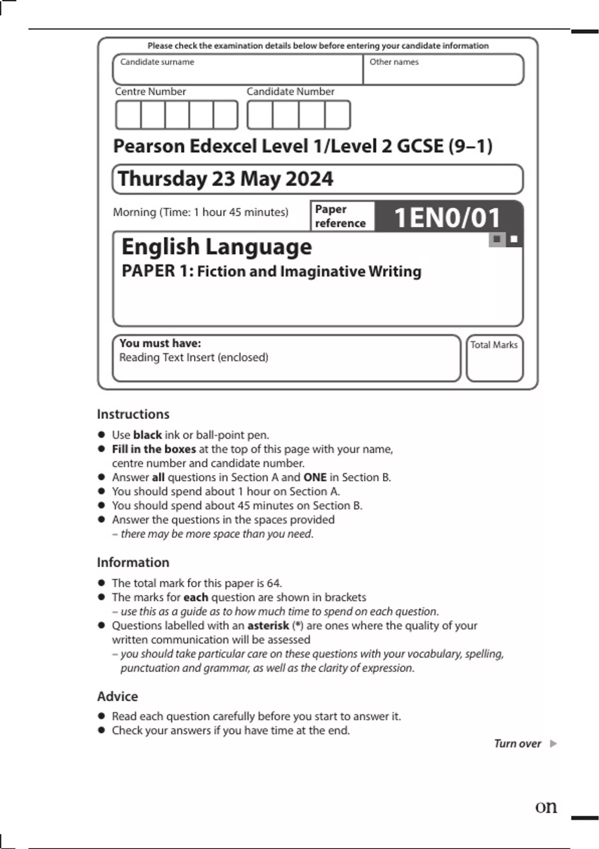 EDEXCEL ENGLISH LANGUAGE GCSE JUNE 2024 PAPER 1 QP