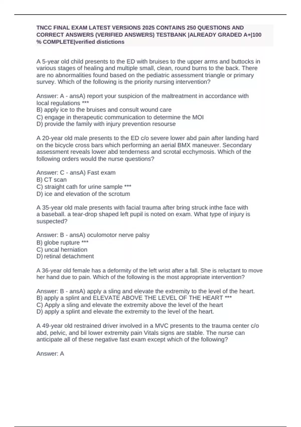 TNCC NURSING PROCESS 2025 | ALREADY GRADED A+ TESTBANK|100% COMPLETE DISTINCTIONS A - primary survey - ANS- Across the room - Airway - Alertness (AVPU) B - primary survey - ANSBreathing and ventilation C - primary survey - ANSCirculation and bleeding (control of hemorrhage) D - primary survey - ANSDisability (neurologic status) - GCS E - primary su