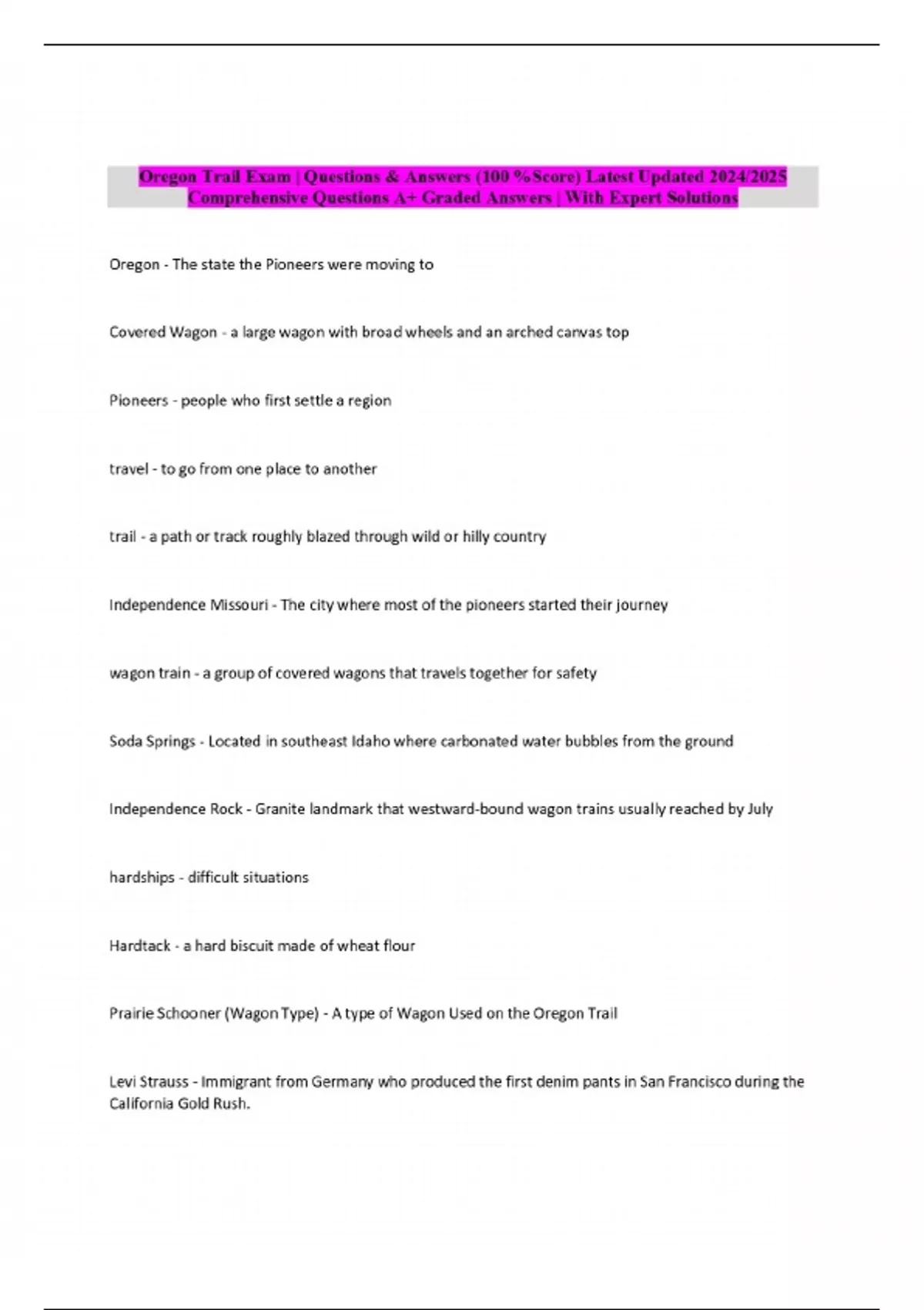 Oregon Trail Exam | Questions & Answers 3 Exam (elaborations) Oregon Trail Exam | Questions & Answers 4 Exam (elaborations) Oregon Trail Exam | Questions & Answers 5 Exam (elaborations) Oregon Trail Exam | Questions & Answers 6 Exam (elaborations) Oregon Trail Facts Exam | Questions & Answers 7 Exam (elaborations) Oregon Trail Facts Final Exam | Qu