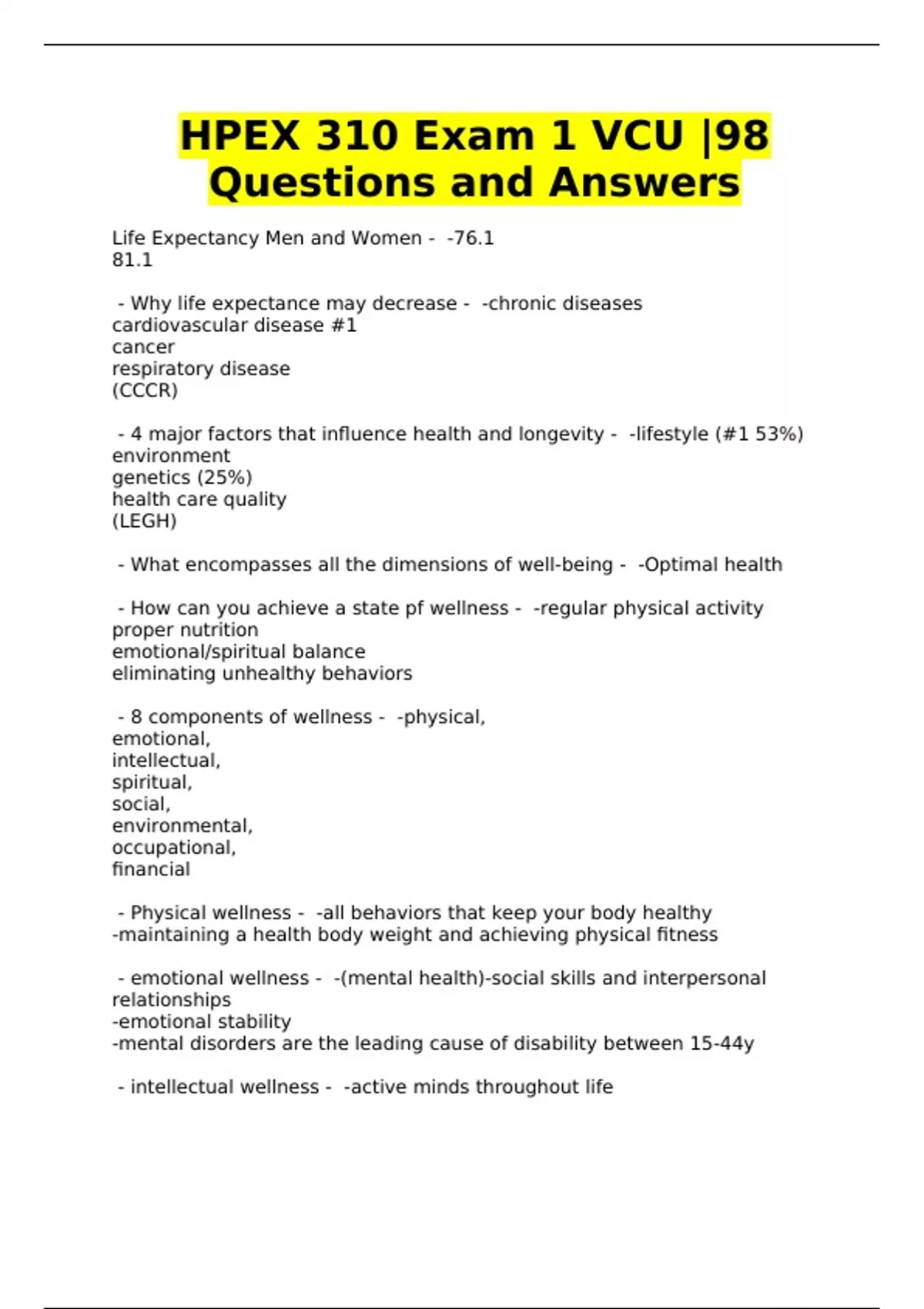HPEX 310 VCU Exam 2 |104 Questions and answers A+ Rated