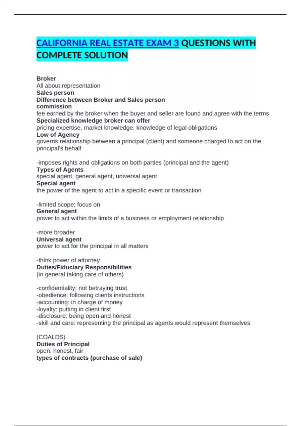 BUNDLED CALIFORNIA REAL ESTATE EXAM QUESTIONS WITH COMPLETE SOLUTION