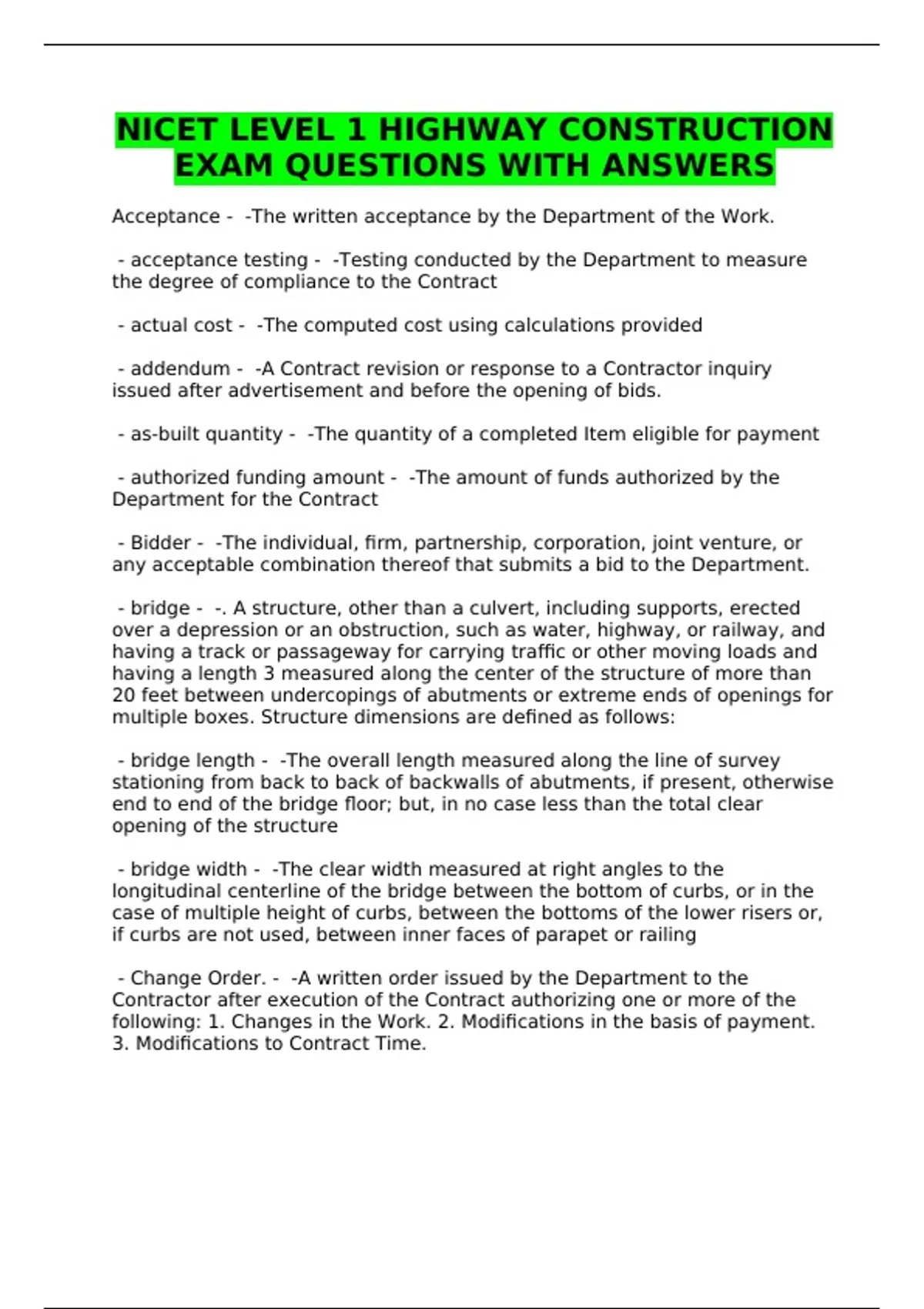NICET LEVEL 1 HIGHWAY CONSTRUCTION EXAM QUESTIONS WITH ANSWERS