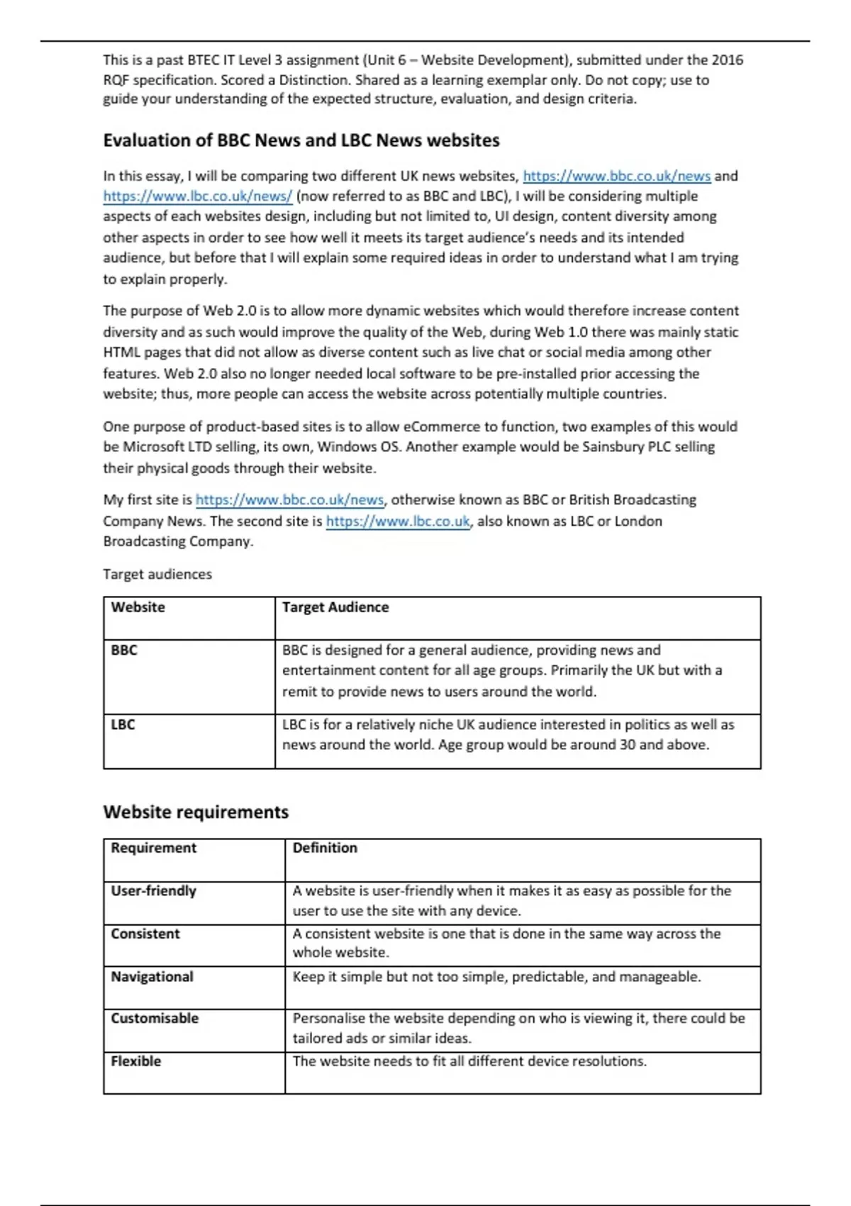 This bundle contains both Assignment 1 and Assignment 2 for BTEC IT Level 3 Unit 6 – Website Development, submitted under the 2016 RQF specification and graded Distinction.