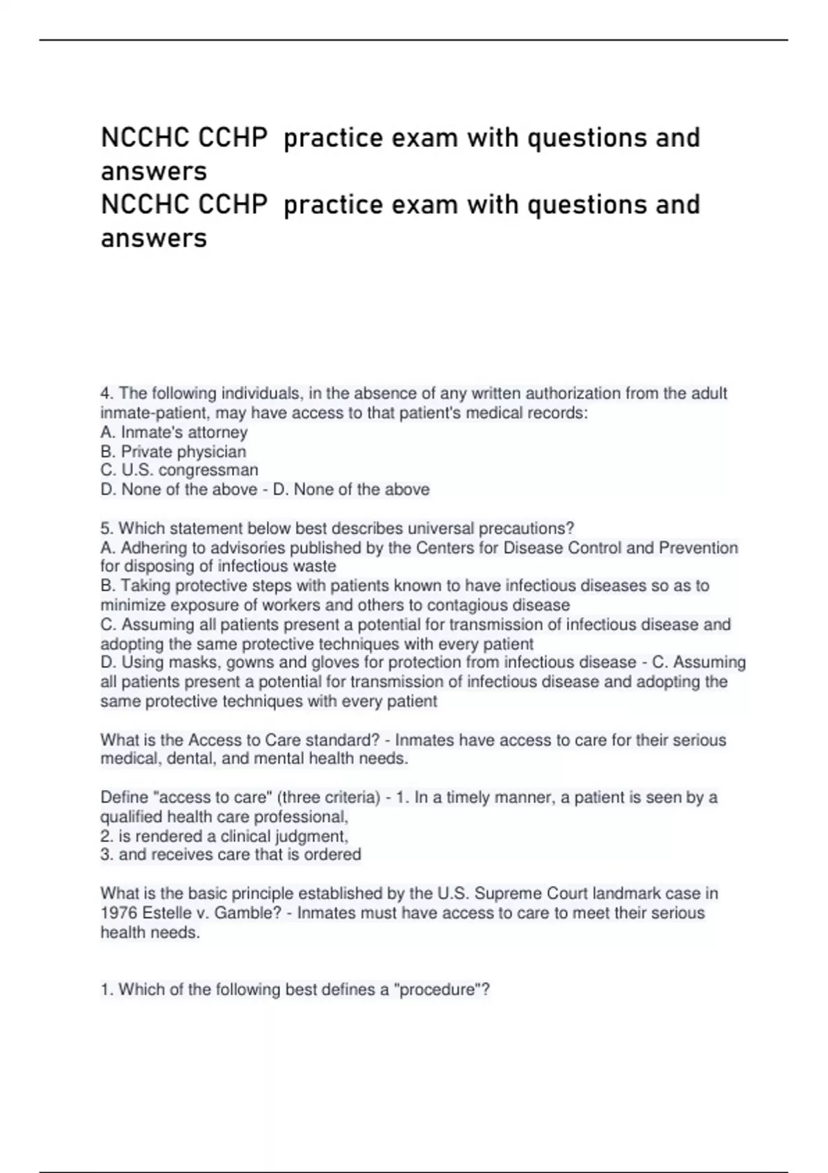 NCCHC CCHP Exam, CCHP Final Exam - Quizzes Recent Questions with Detailed Verified Answers and Correct Answers Already Graded A+