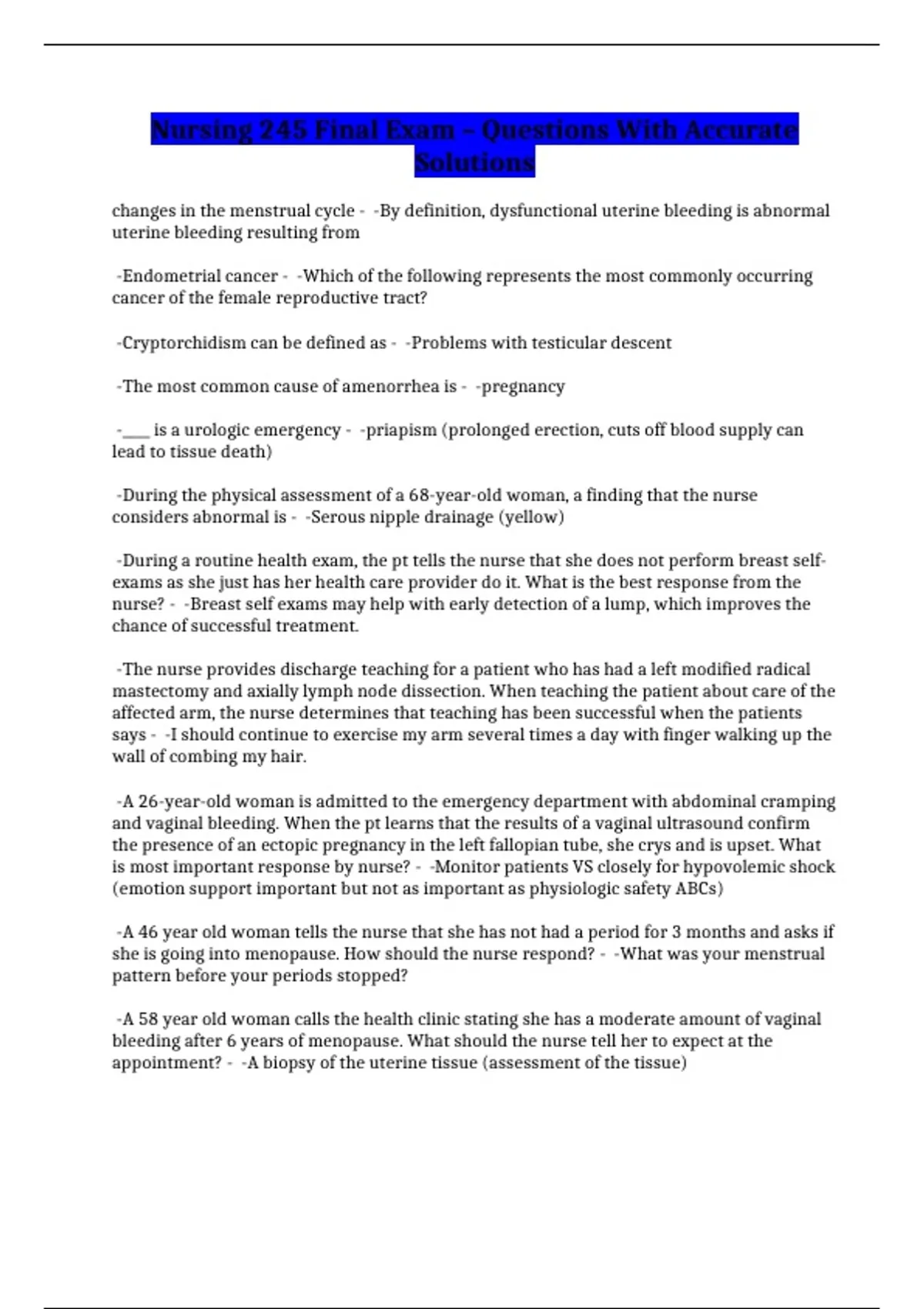 Nursing 245 Final Exam – Questions With Accurate Solutions