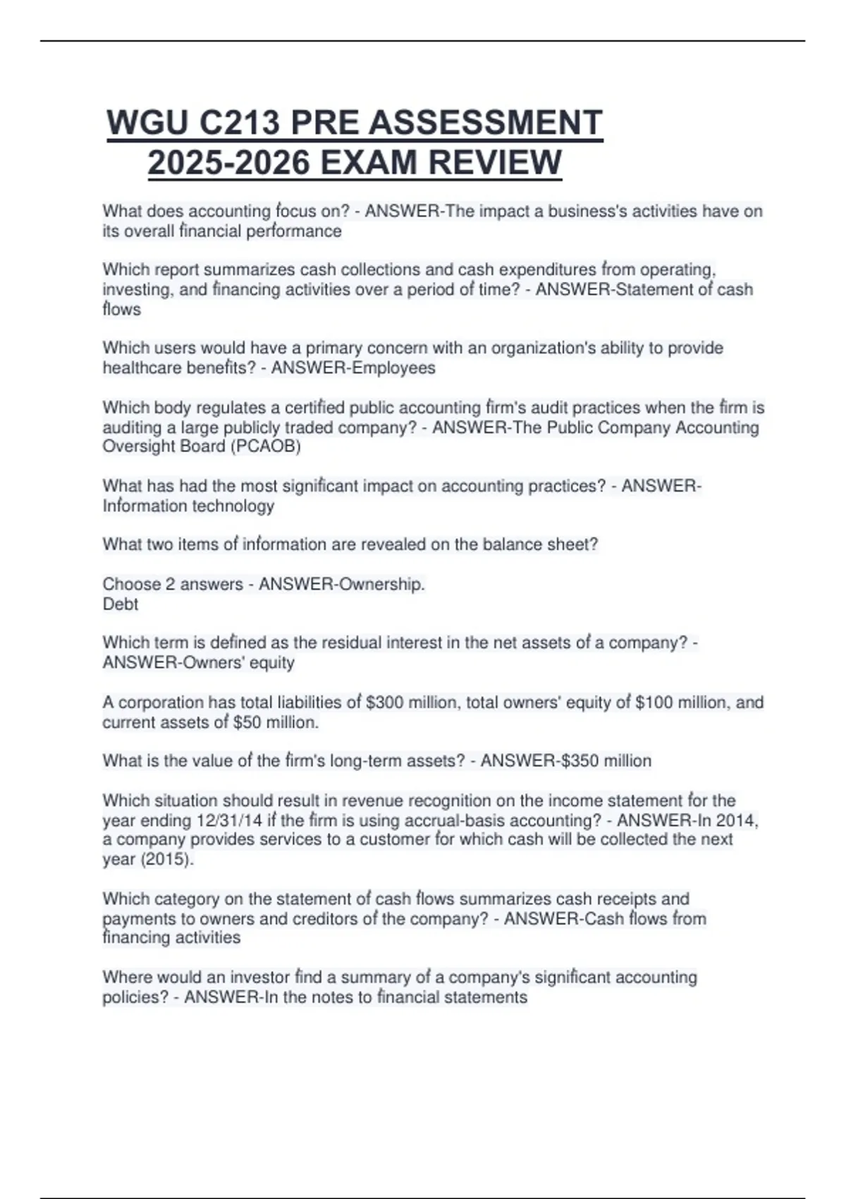 () C213 ACCOUNTING COMPLETE QUESTIONS AND ACCURATE ANSWERS ACCOUNTING FOR DECISION MAKERS - C213 PRE ASSESSMENT TEST PRACTICE LATEST VERSION WGU C213 ACCOUNTING PRACTICE EXAM QUESTIONS AND CORRECT ANSWERS WGU C213 ACCOUNTING EXAM QUESTIONS AND ANSWERS WITH EXPLANATIONS FINAL WGU C213 STUDY GUIDE QUESTIONS AND