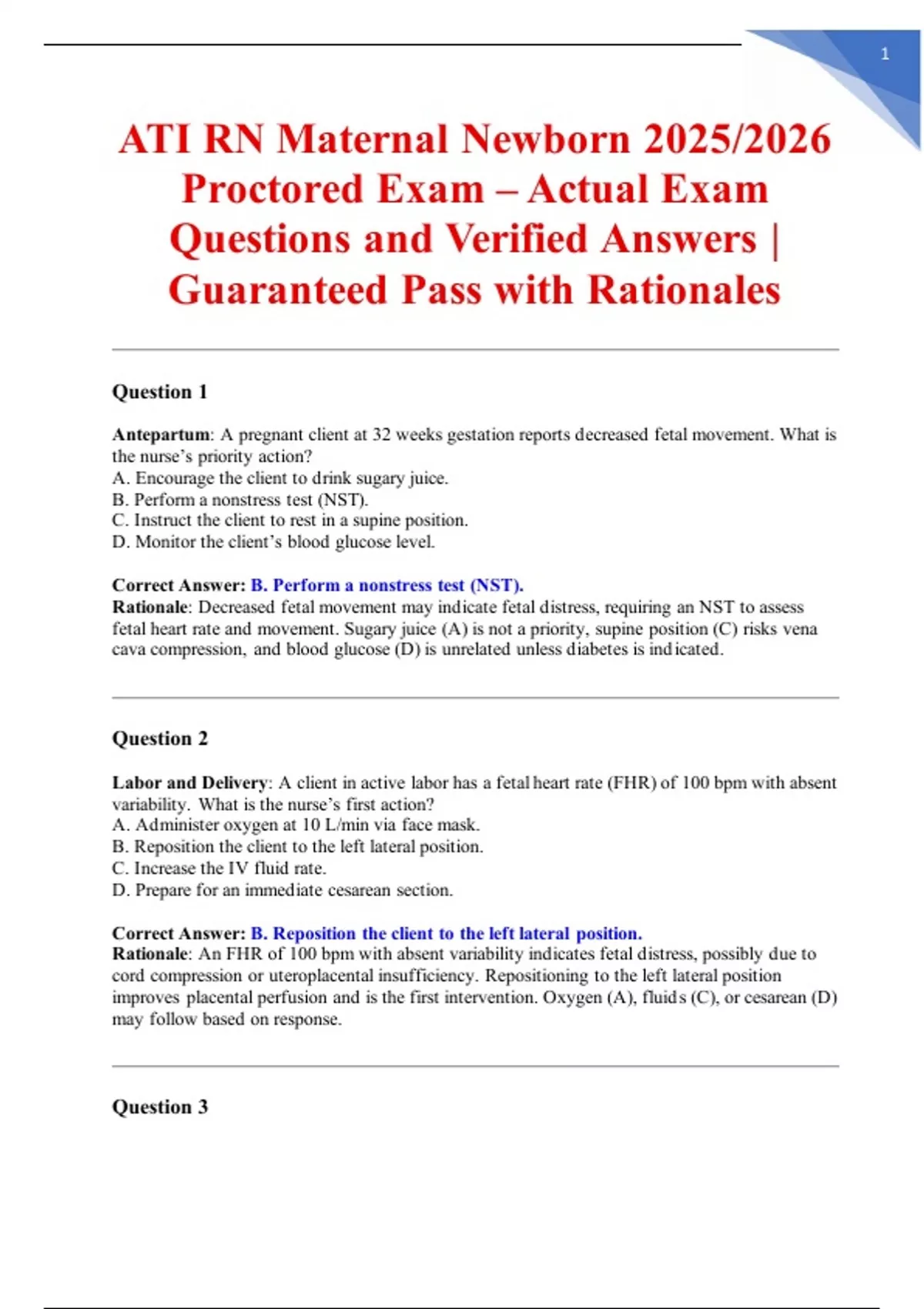 A reliable exam review featuring updated ATI Maternal Newborn questions, correct answers, and expert explanations. Covers perinatal, obstetric, and neonatal nursing essentials.