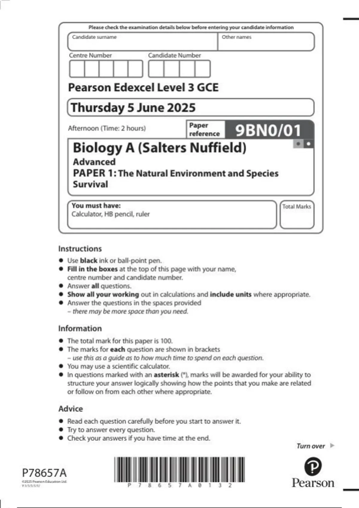 Pearson Edexcel a level Biology A| question paper |2025|9BN0/01|