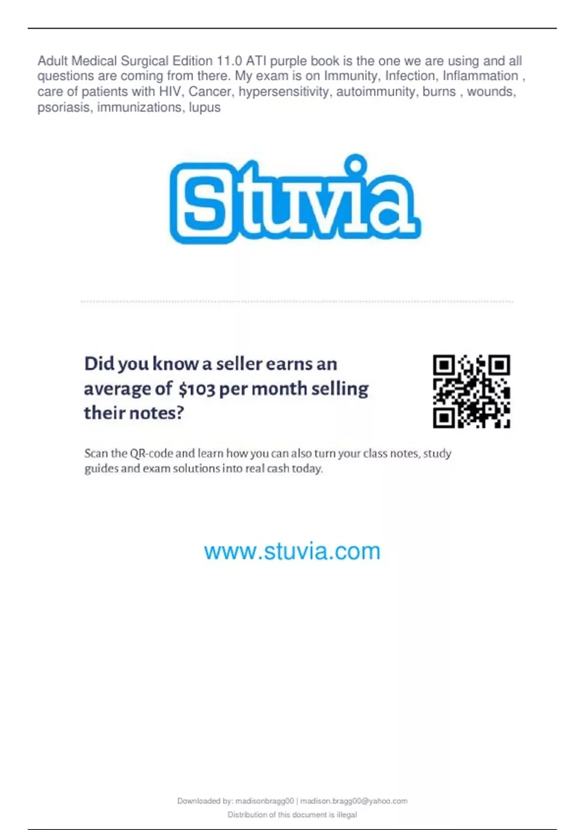 Adult Medical Surgical Edition 11.0 ATI purple book is the one we are using and all questions are coming from there. My exam is on Immunity, Infection, Inflammation , care of patients with HIV, Cancer, hypersensitivity, autoimmunity, burns , wounds, psori