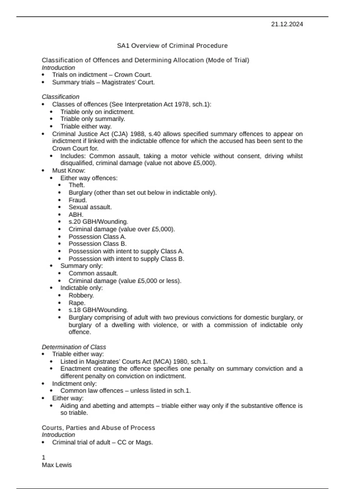 Summary SA1 Overview of Criminal Procedure