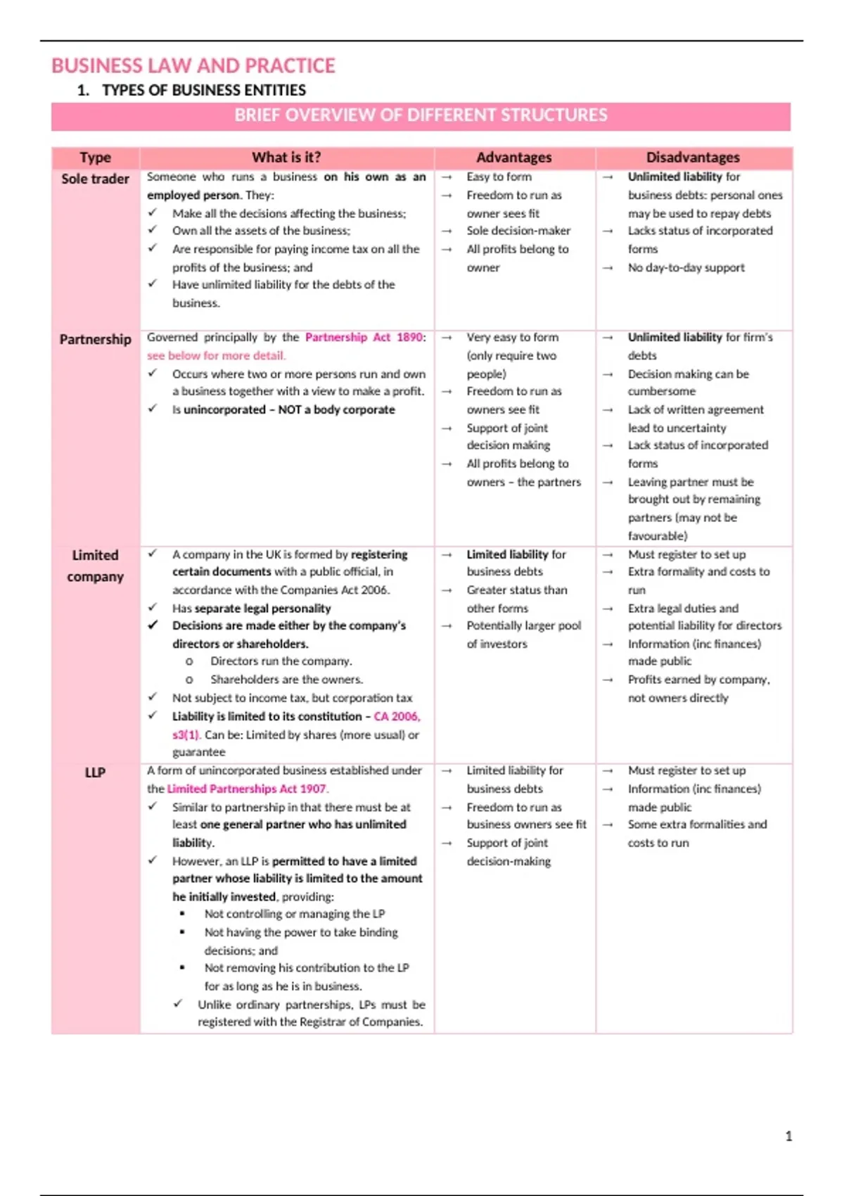 Summary LPC Bussiness Law and Practice Workshop 1 revision notes