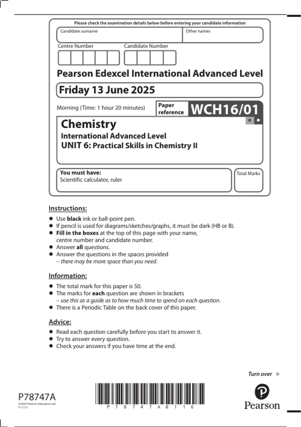 Pearson Edexcel International Advanced Level Chemistry UNIT 6 JUNE 2025 QUESTION PAPER: Practical Skills in Chemistry II