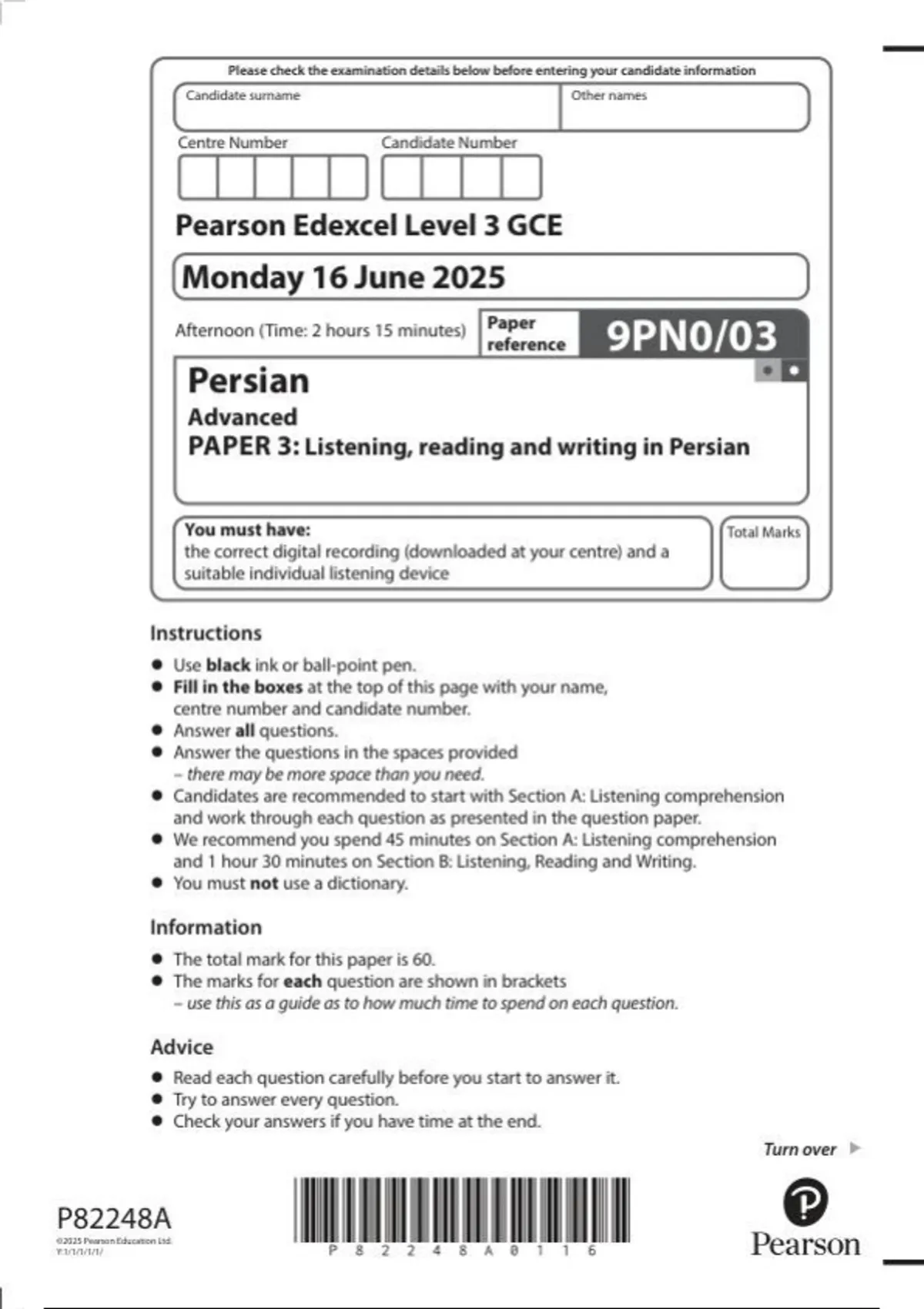 Pearson Edexcel a level Persian |question paper | 2025| 9PN0/03